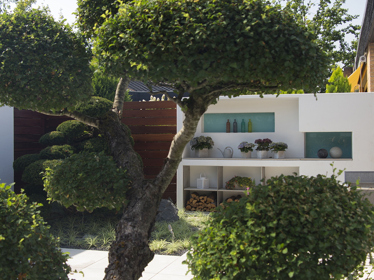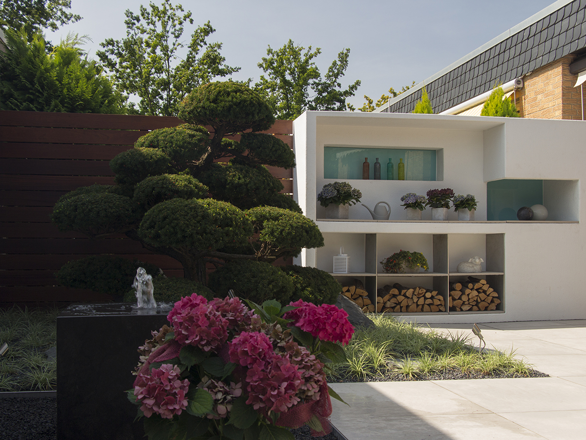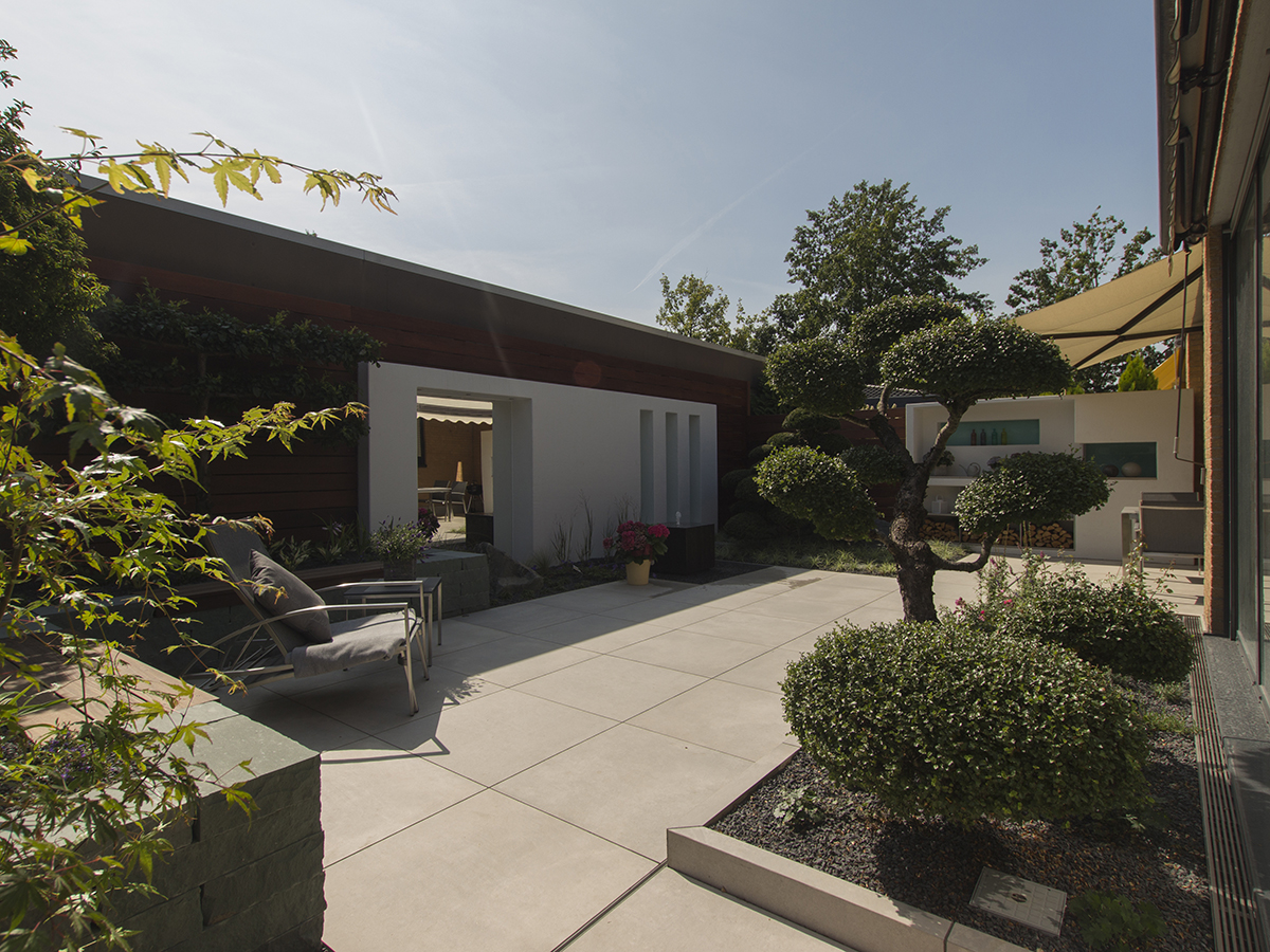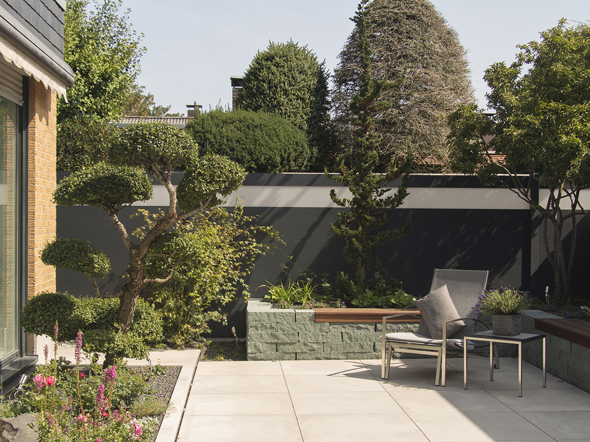 Um den Stil des Innenraums auf die Außenfläche zu übertragen, wurden der Atriumgarten mit den gleichen großen Fliesen gestaltet, die auch im Wohnbereich verwendet wurden. Die vom Nachbarsgrundstück angrenzende Mauer, die genau in Blickrichtung verlief, wurde mit einer Holzverkleidung kaschiert: Sie verleiht dem ehemals unansehnlichen Mauerwerk eine hochwertige, urbane Optik, die durch eine Flexiwand sowie ein vorgelagertes Hochbeet mit integrierten Sitzflächen nochmals verstärkt wird. Für die Begrünung wurden gemeinsam mit dem Kunden Pflanzen ausgesucht, die aufgrund ihres Alters und ihrer Größe den Anschein erwecken, dass der Garten bereits seit mehreren Jahren seinen Besitzern Freude bereitet. Im Zusammenspiel mit Loungemöbeln und einem Wasserspiel entstand so eine gemütliche Atmosphäre, die den Garten zu einem beliebten Rückzugsort hat werden lassen.
