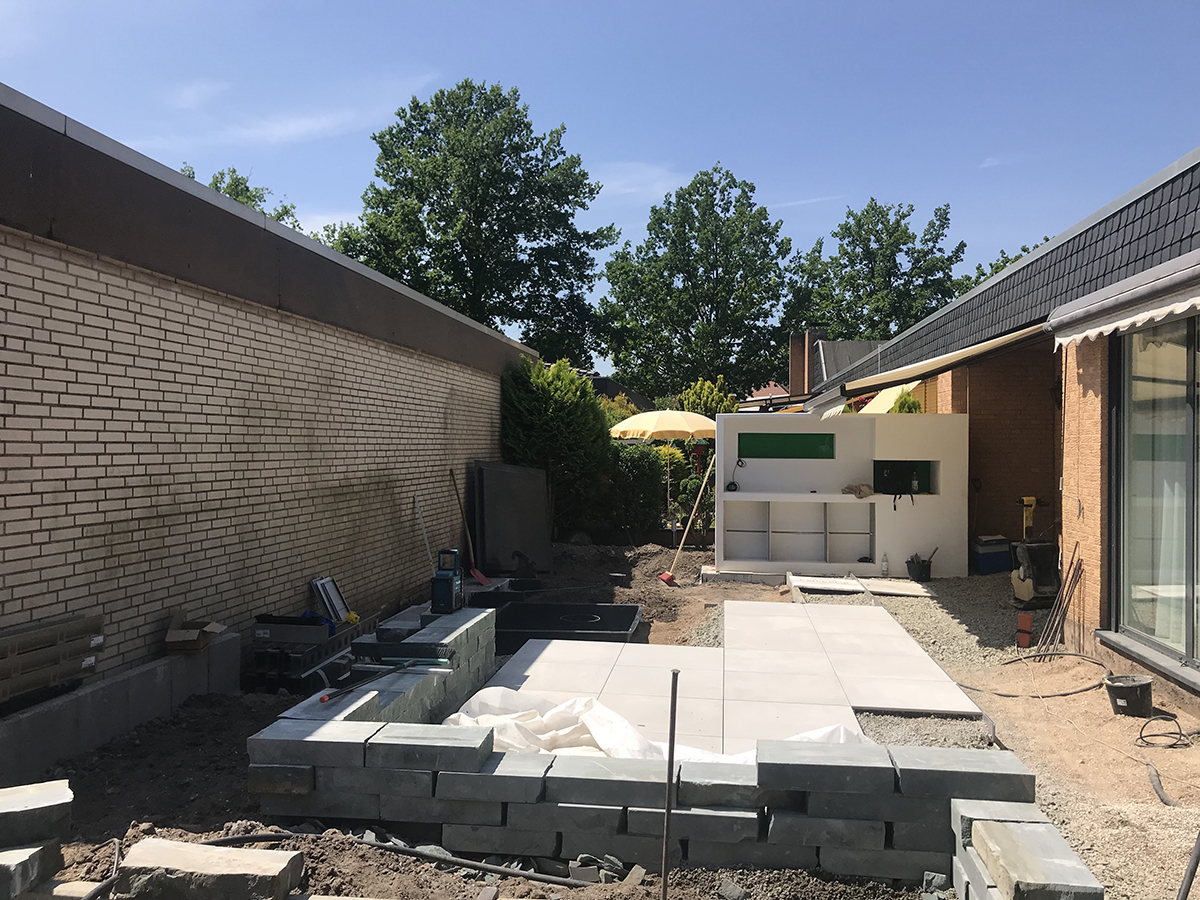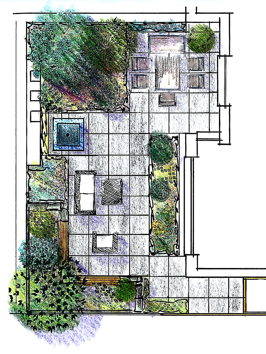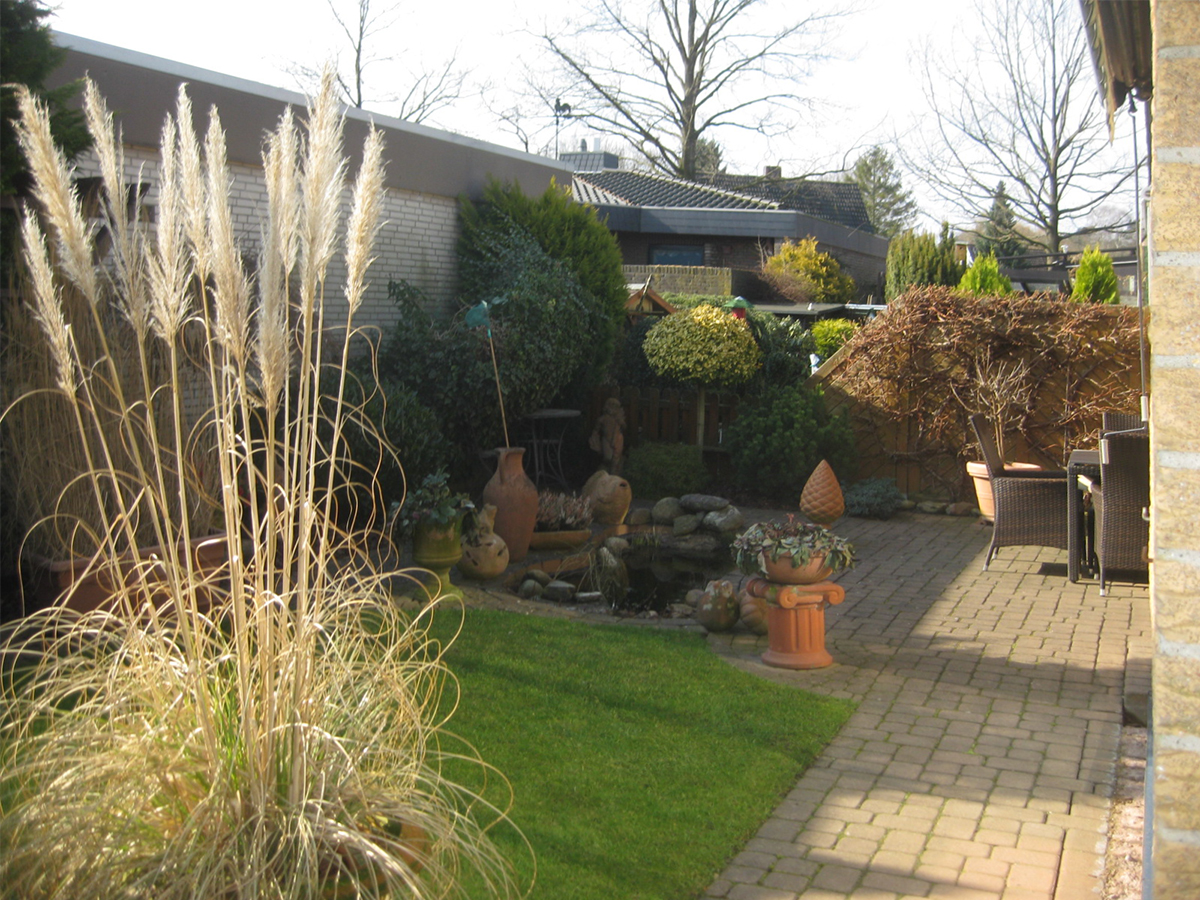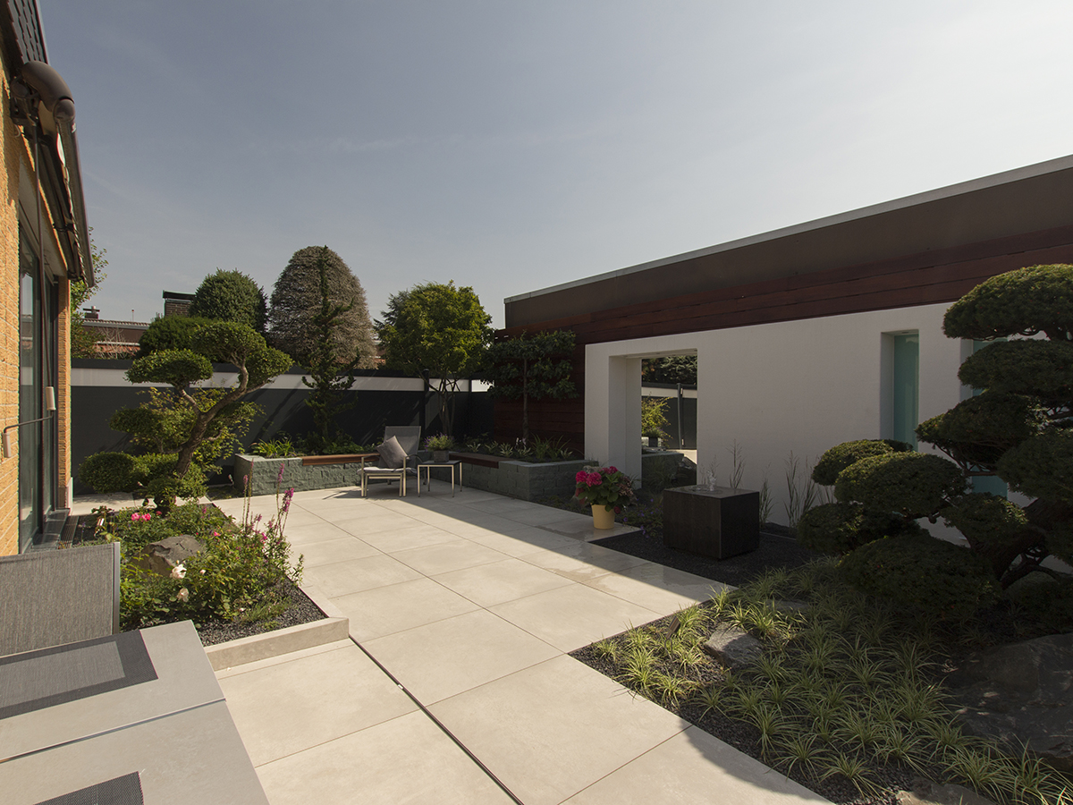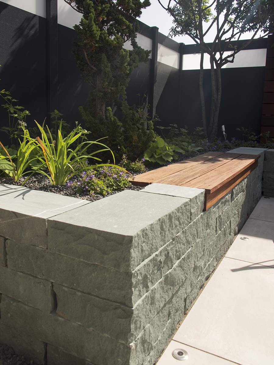 Um den Stil des Innenraums auf die Außenfläche zu übertragen, wurden der Atriumgarten mit den gleichen großen Fliesen gestaltet, die auch im Wohnbereich verwendet wurden. Die vom Nachbarsgrundstück angrenzende Mauer, die genau in Blickrichtung verlief, wurde mit einer Holzverkleidung kaschiert: Sie verleiht dem ehemals unansehnlichen Mauerwerk eine hochwertige, urbane Optik, die durch eine Flexiwand sowie ein vorgelagertes Hochbeet mit integrierten Sitzflächen nochmals verstärkt wird. Für die Begrünung wurden gemeinsam mit dem Kunden Pflanzen ausgesucht, die aufgrund ihres Alters und ihrer Größe den Anschein erwecken, dass der Garten bereits seit mehreren Jahren seinen Besitzern Freude bereitet. Im Zusammenspiel mit Loungemöbeln und einem Wasserspiel entstand so eine gemütliche Atmosphäre, die den Garten zu einem beliebten Rückzugsort hat werden lassen.