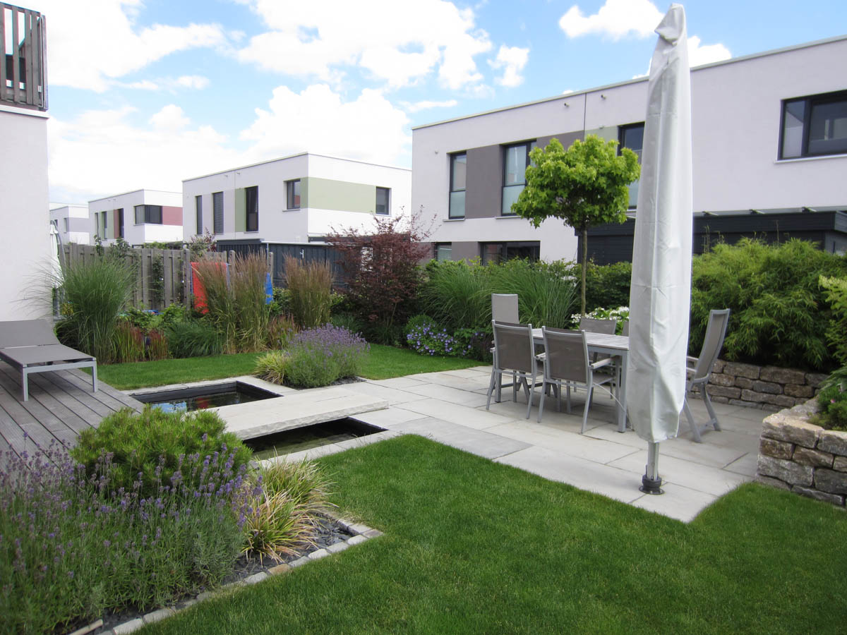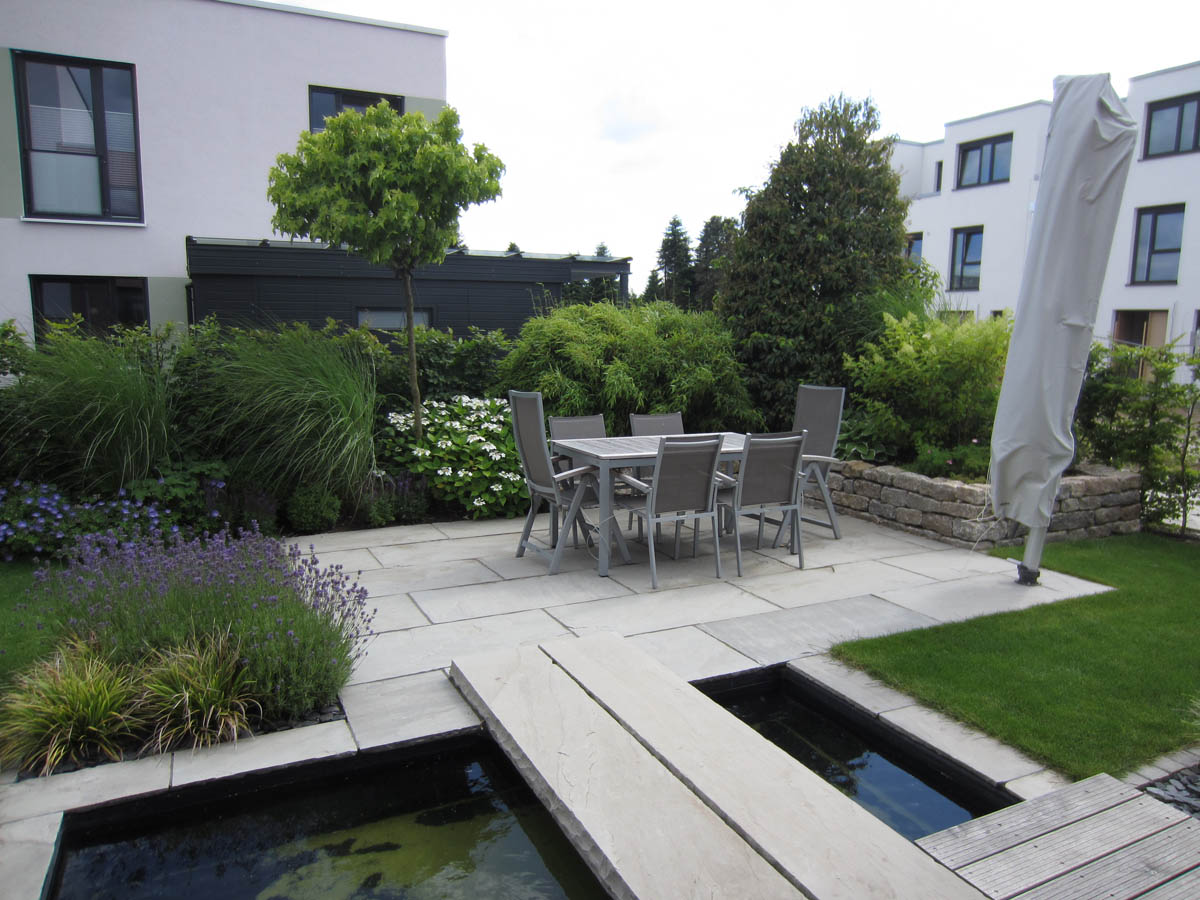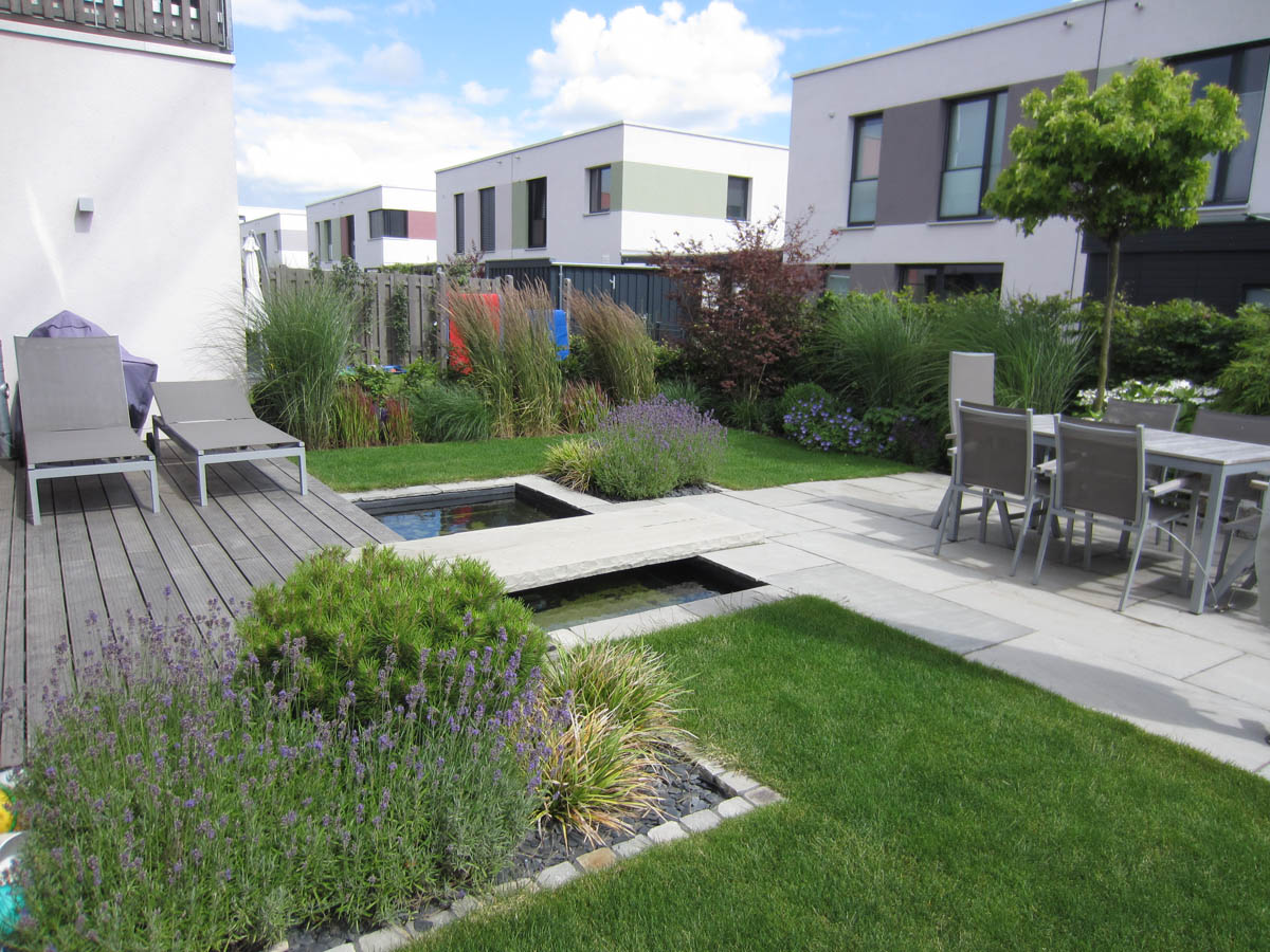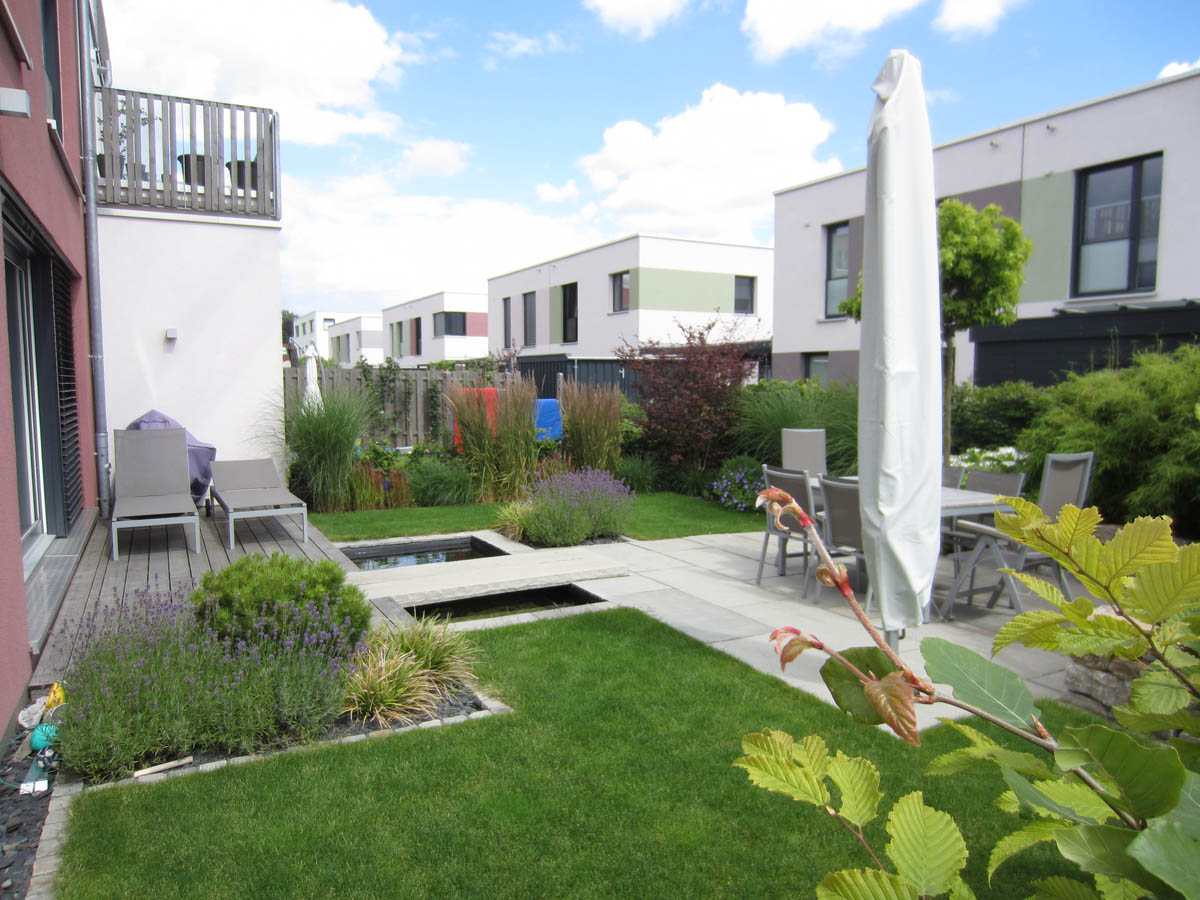 Die Neuanlage dieses Gartens sollte dem modern-architektonischen Stil des Hauses entsprechen. Entspannung wünschte man sich auf einem Sitzplatz neben einem Wasserbecken und einem Sonnendeck.