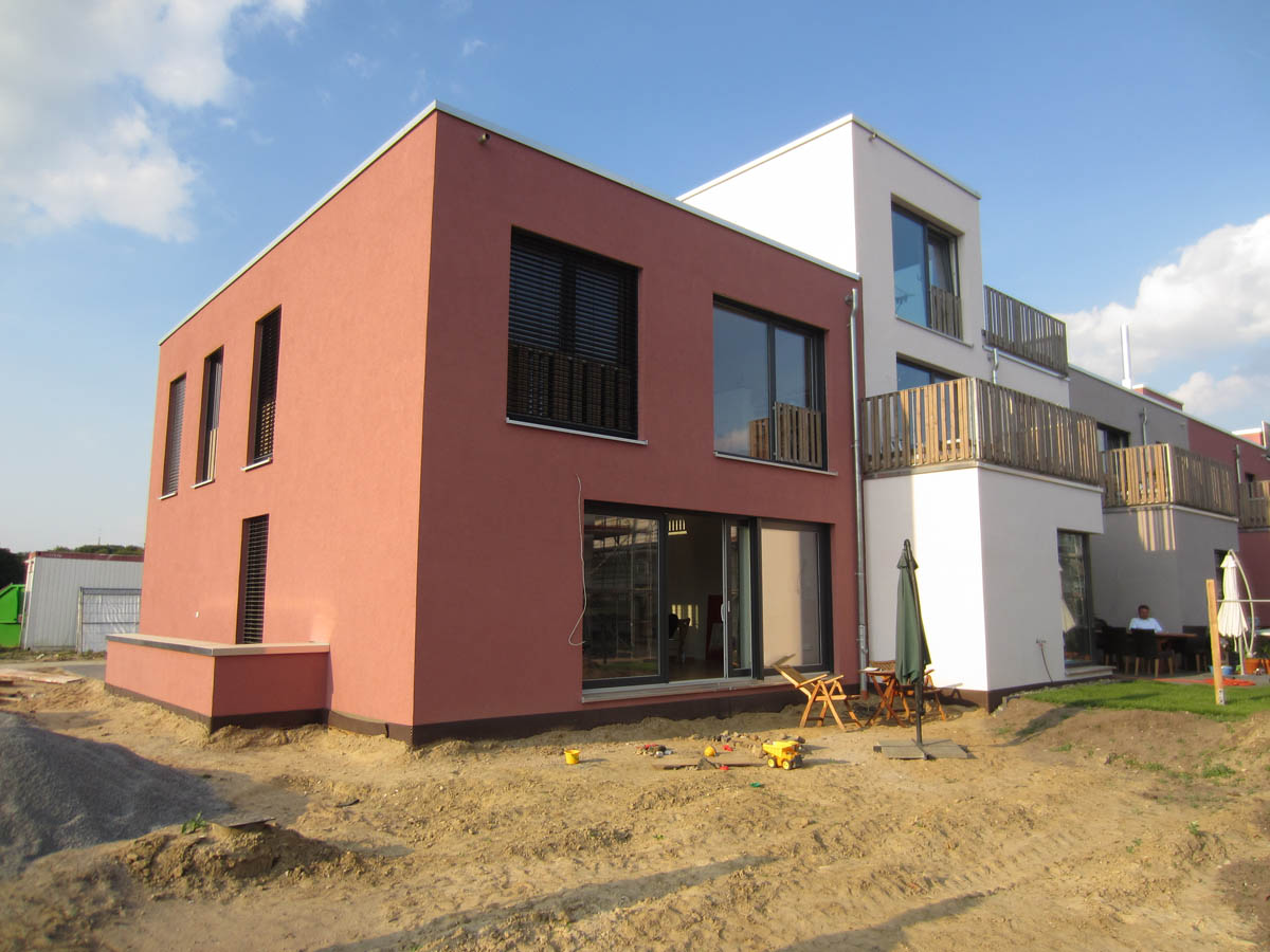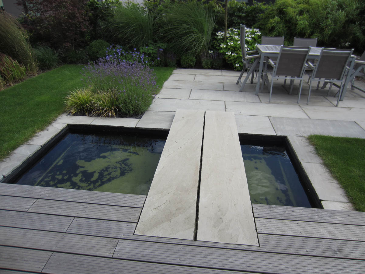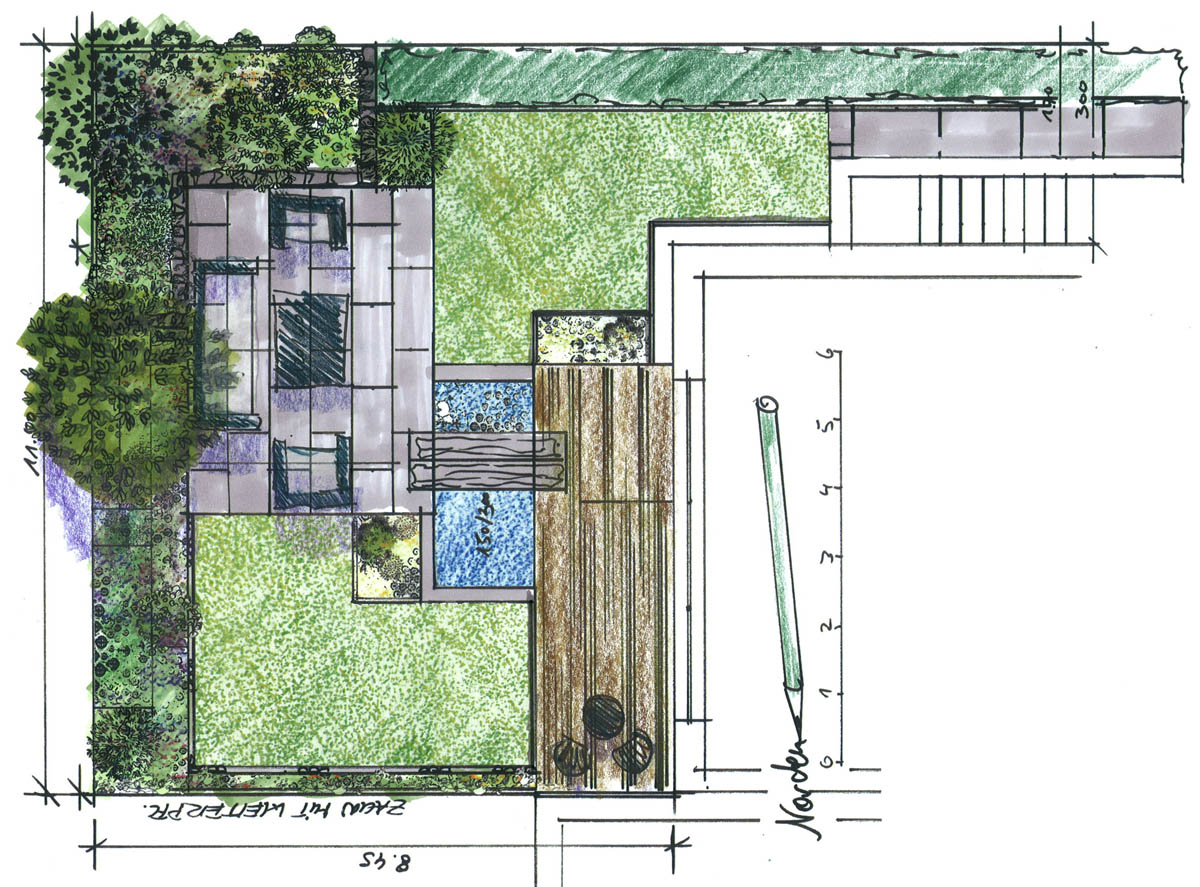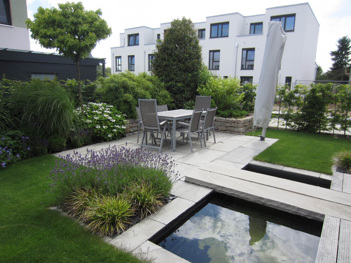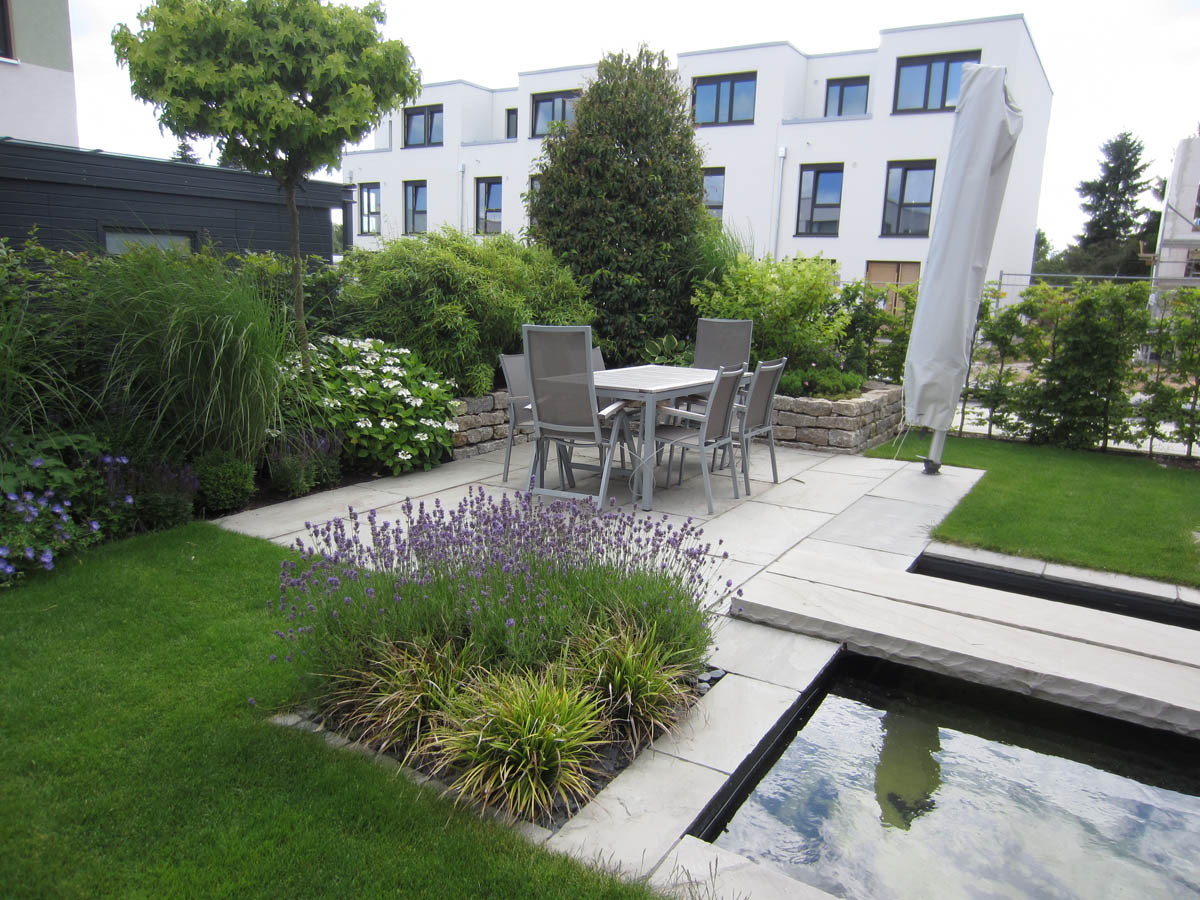 Die Neuanlage dieses Gartens sollte dem modern-architektonischen Stil des Hauses entsprechen. Entspannung wünschte man sich auf einem Sitzplatz neben einem Wasserbecken und einem Sonnendeck.