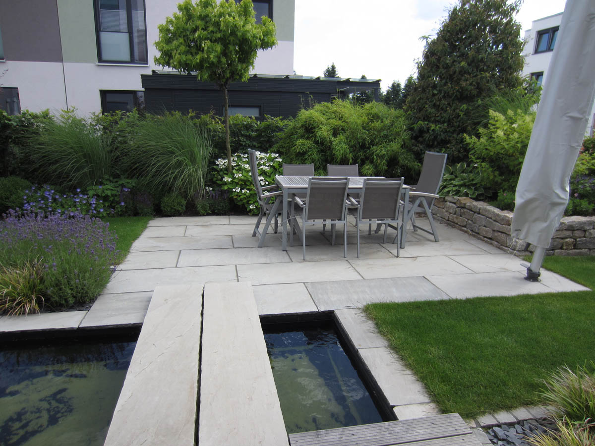 Ein Perspektivenwechsel ermöglicht moderne Gartenträume. Wir versetzen den Sitzplatz in den Garten, dafür liegt das Sonnendeck aus Holz vor dem Terrassenfenster. Die Ruhebereiche werden durch einen Natursteinsteg verbunden, der über das eingelassene Wasserbecken führt. So hat man von beiden Ruhezonen den optimalen Gartenblick. Für einen Sichtschutz sorgt ein Trockenmauer-Hochbeet, das zur Straße mit Blühpflanzen und Gräsern bepflanzt ist.