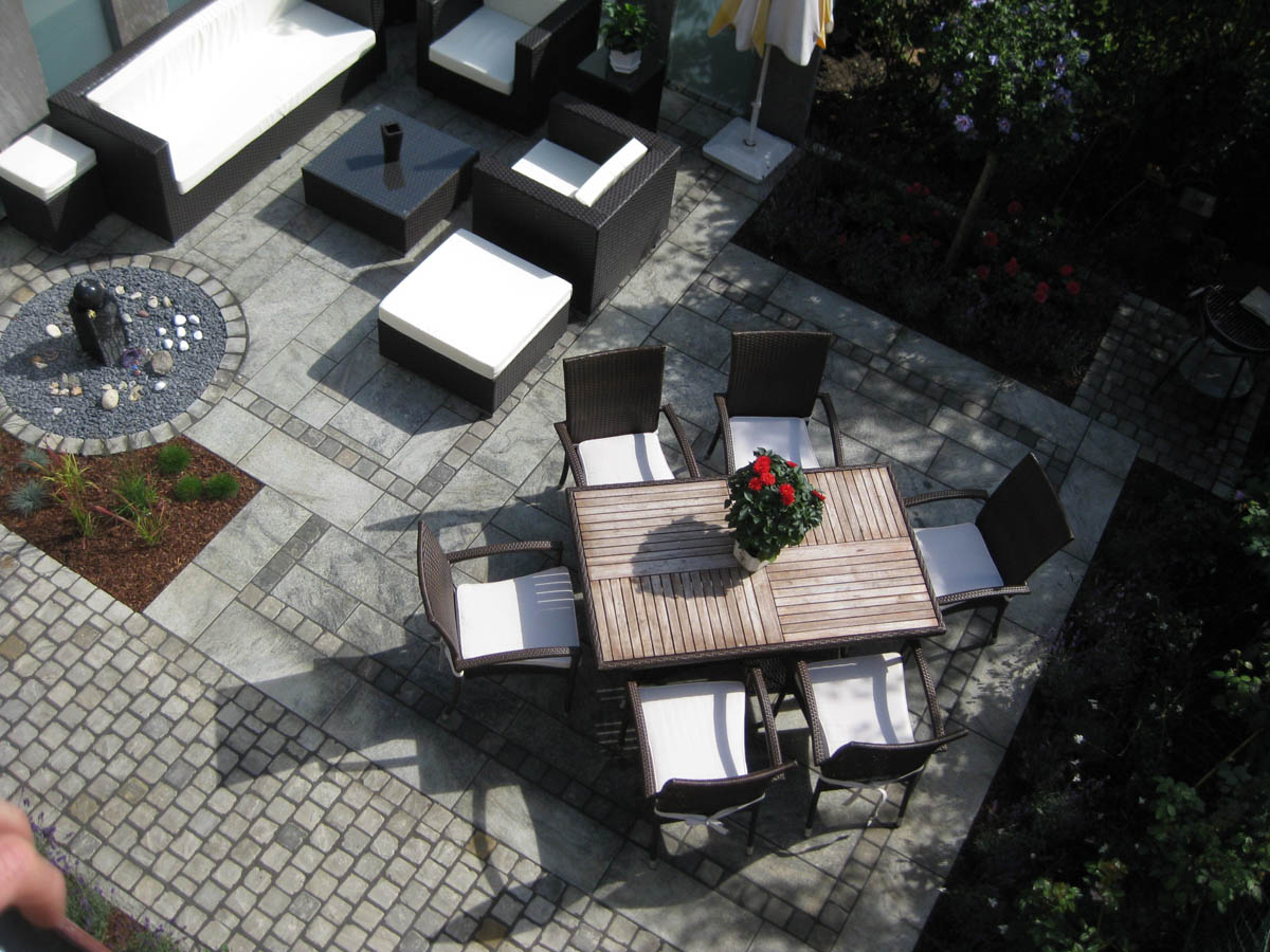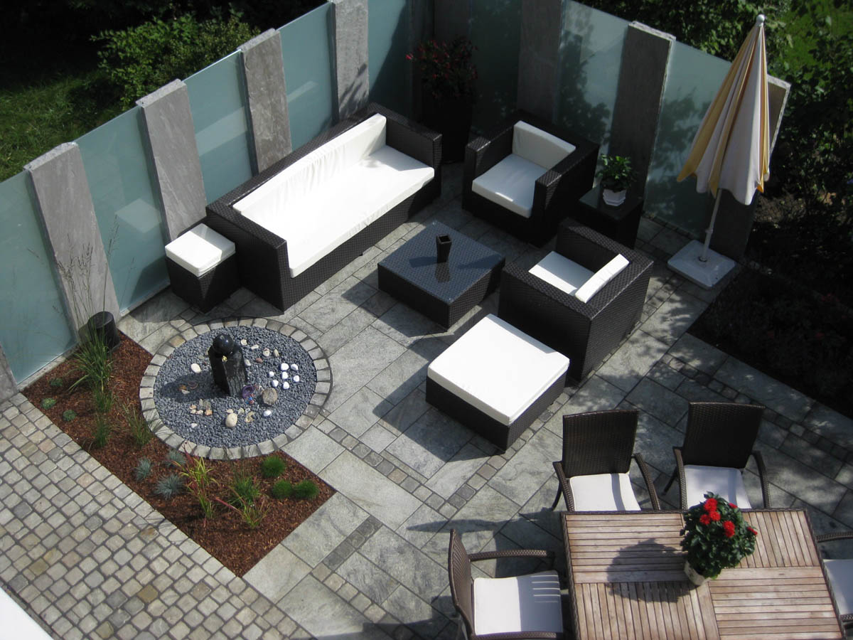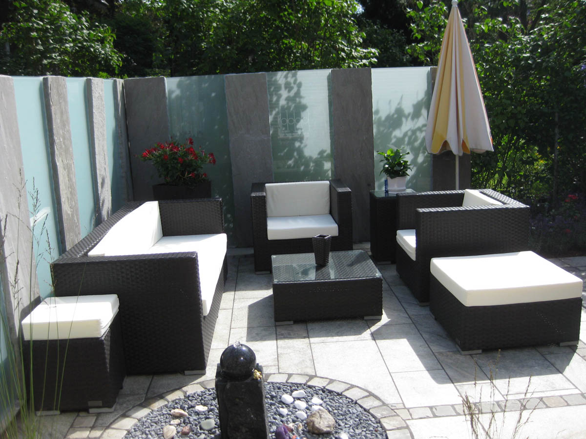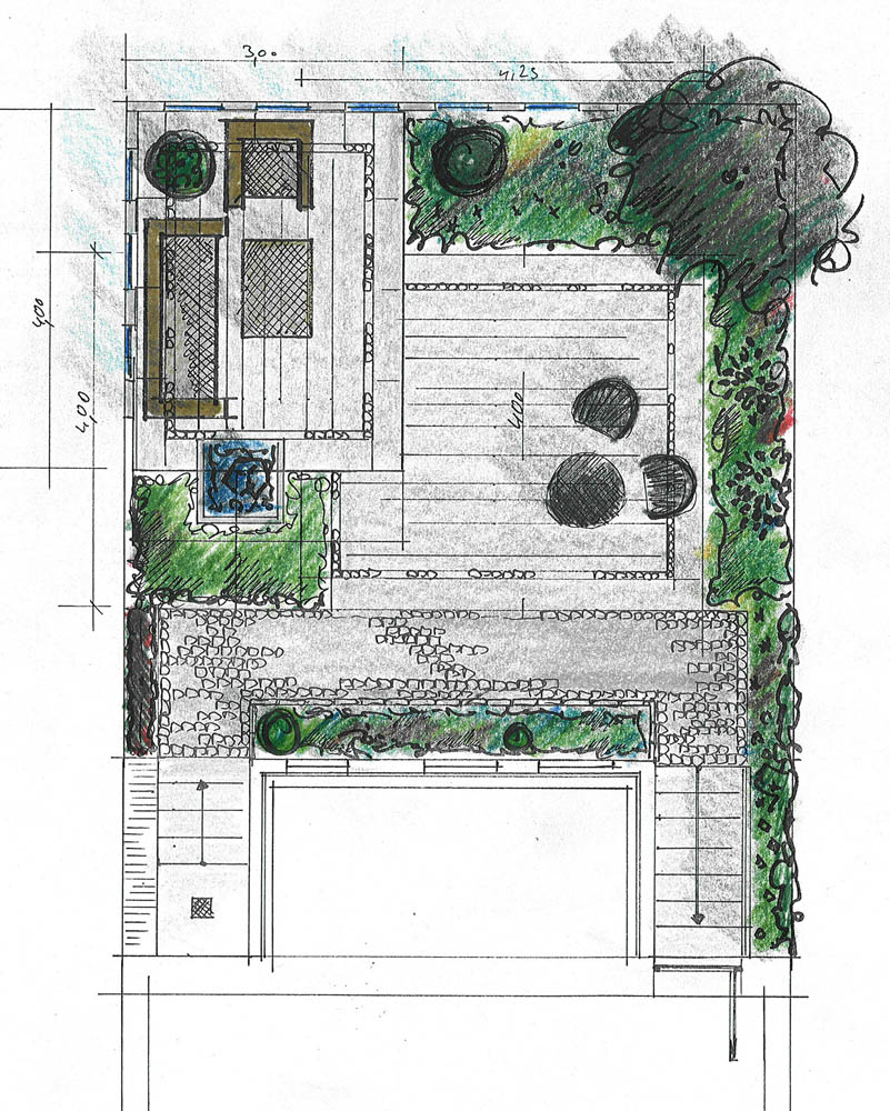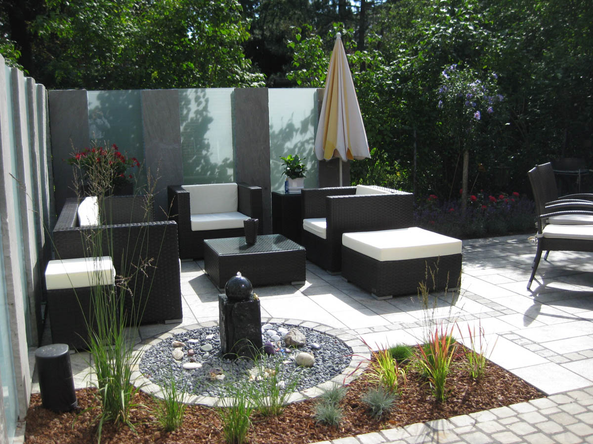 Neben einer Lounge-Gruppe und einem Essplatz soll ein Wasserspiel für Entspannung sorgen. Dabei soll der Sichtschutz zum Nachbarn dezent gestaltet werden.