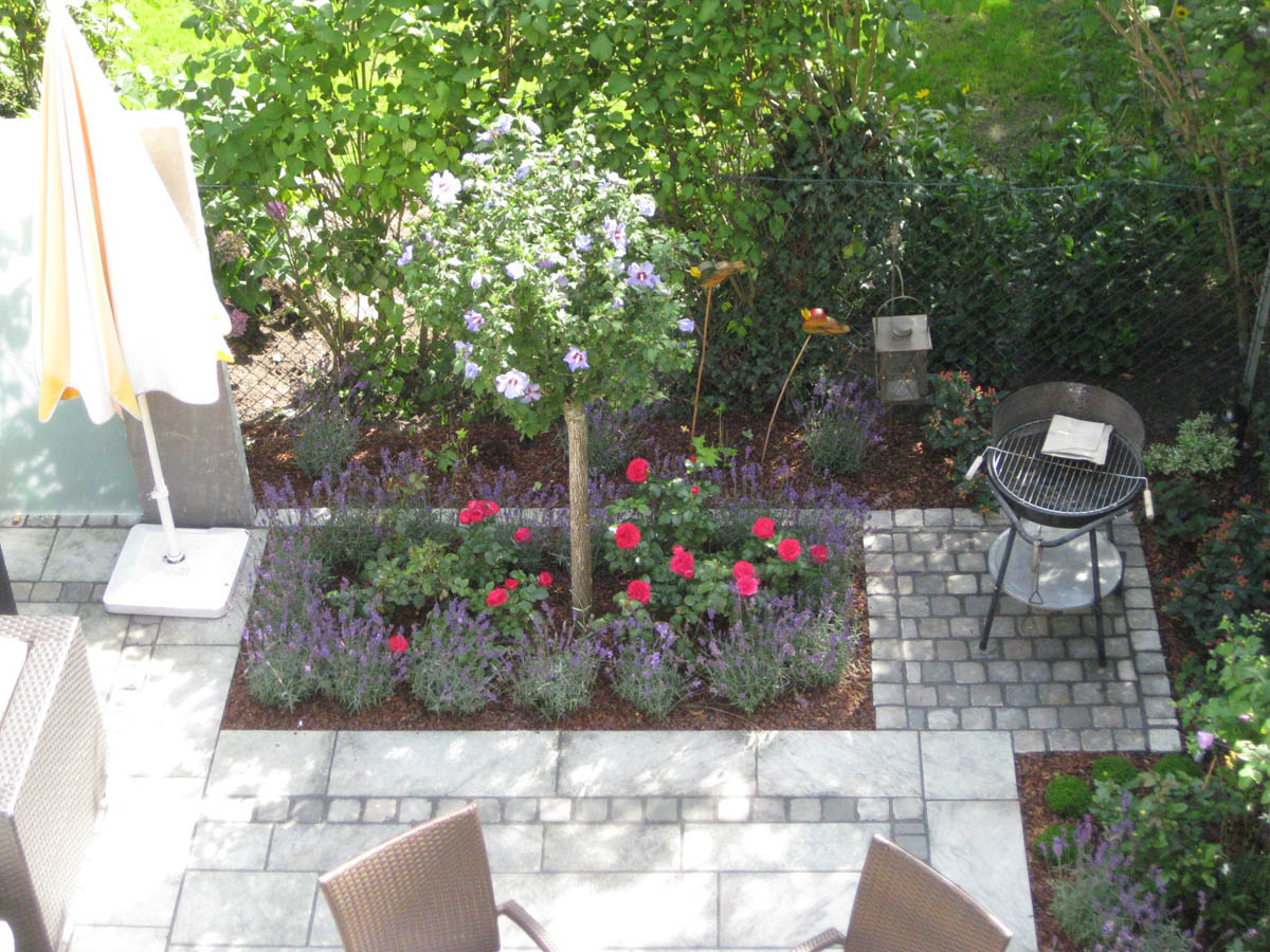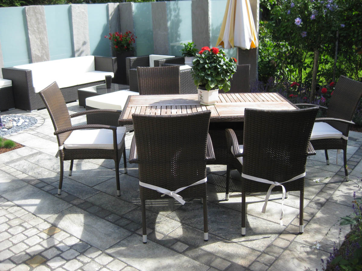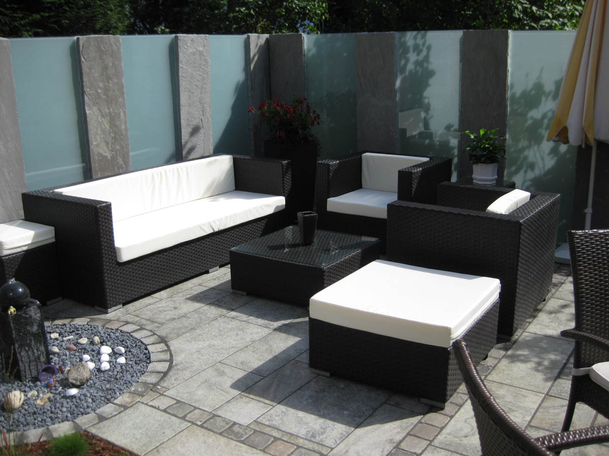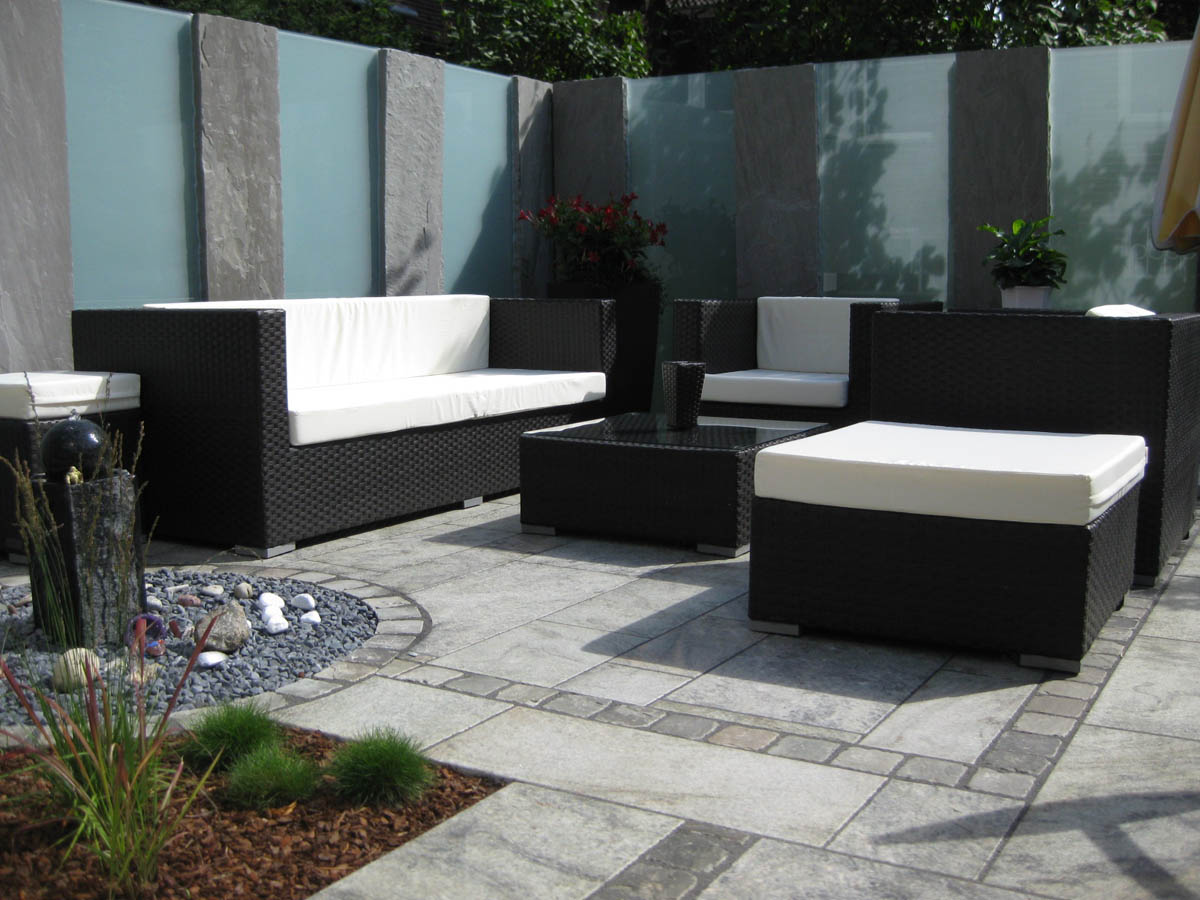 Neben einer Lounge-Gruppe und einem Essplatz soll ein Wasserspiel für Entspannung sorgen. Dabei soll der Sichtschutz zum Nachbarn dezent gestaltet werden.