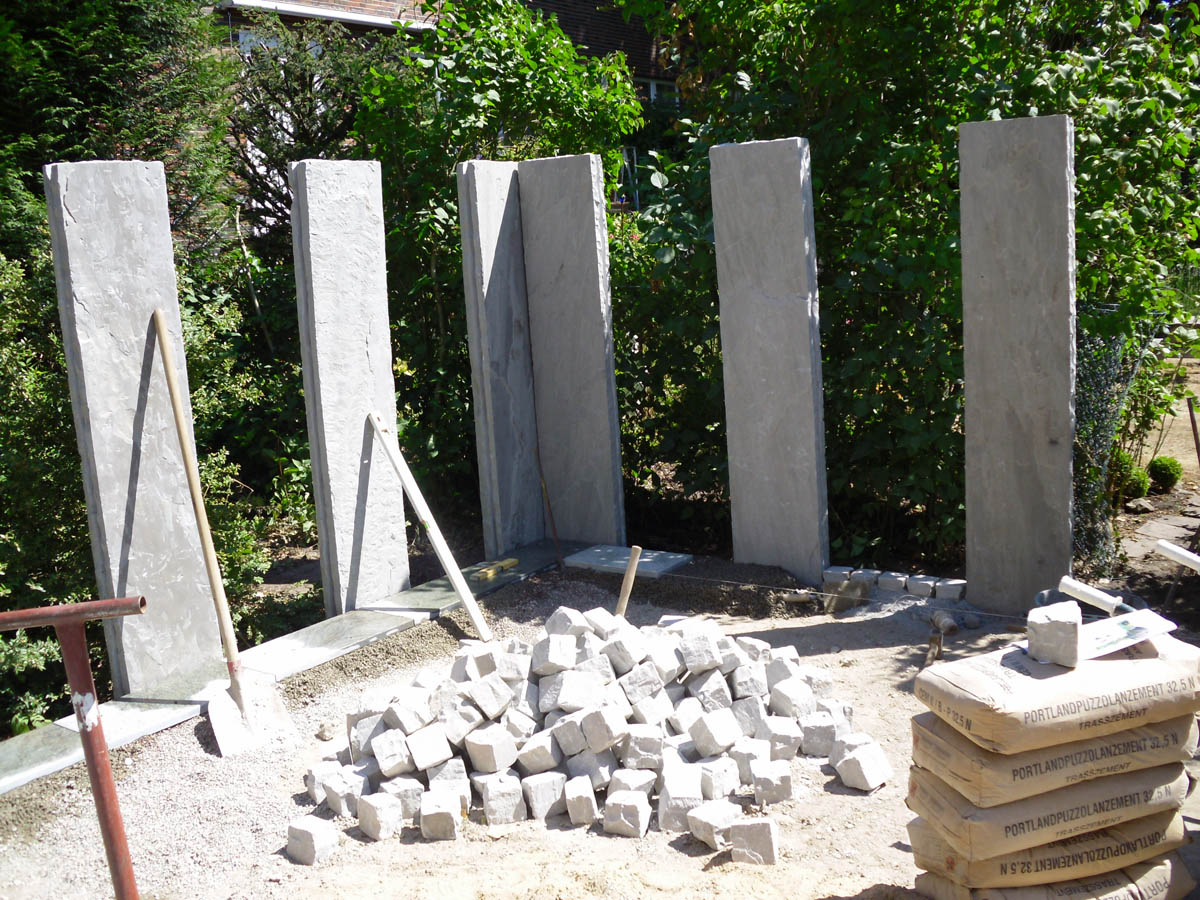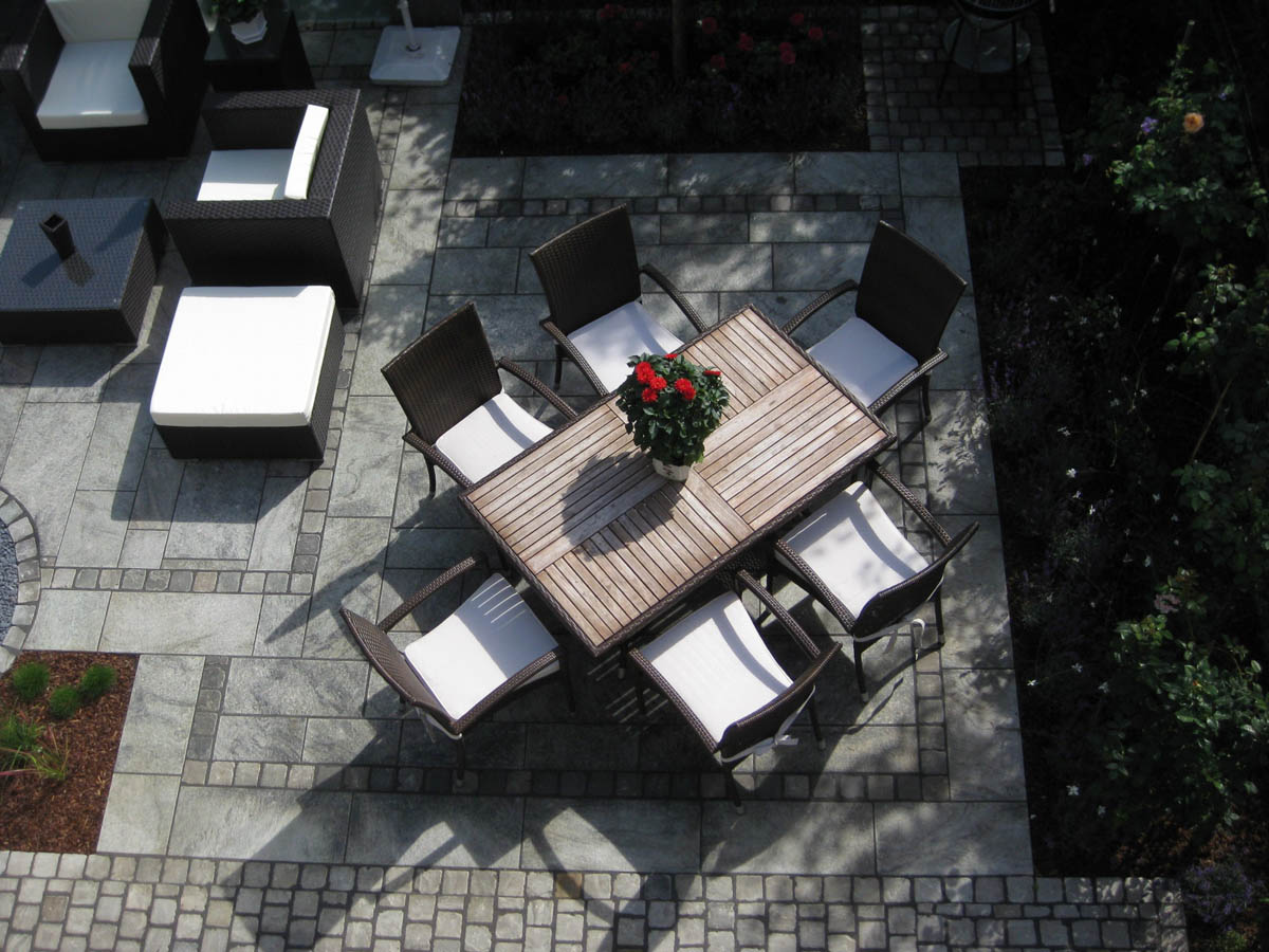 Für gefühlte Weite bei vollem Sichtschutz fassen wir die Grundstücksgrenze ein mit Natursteinpalisaden und Glas. Hier finden ein großzügiger Lounge-Bereich und ein in die Terrasse eingelassenes Wasserspiel Platz. Daneben entstehen ein Essbereich sowie ein Beet für entspannte Bepflanzung. Durch die besondere Verlegung des Terrassenbelags entstehen verschiedene Bereiche – für gefühlte Großzügigkeit auf kleinstem Raum.