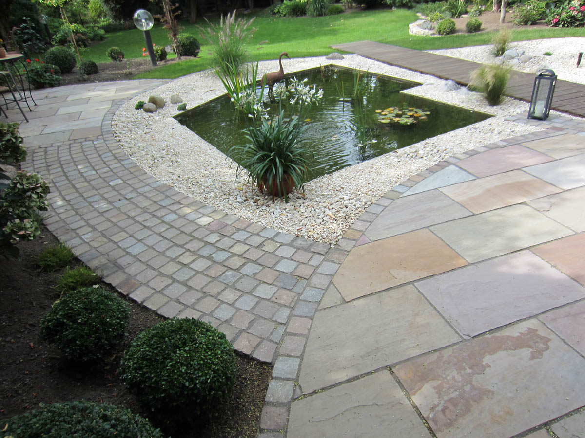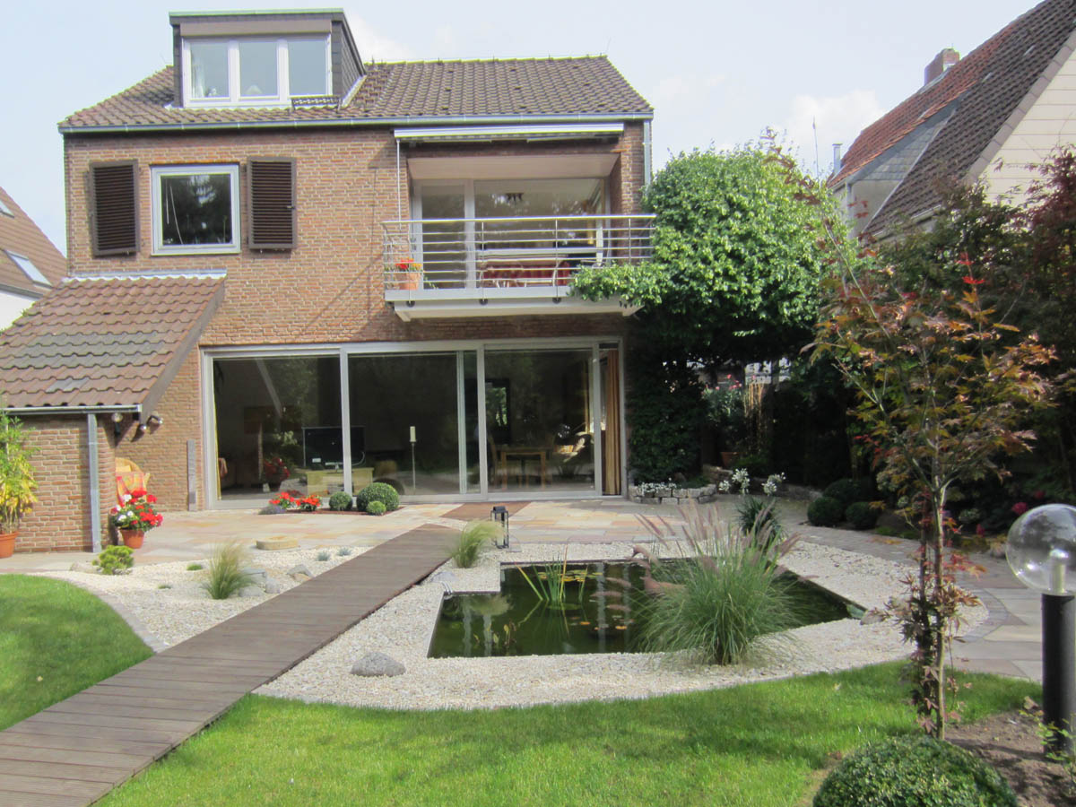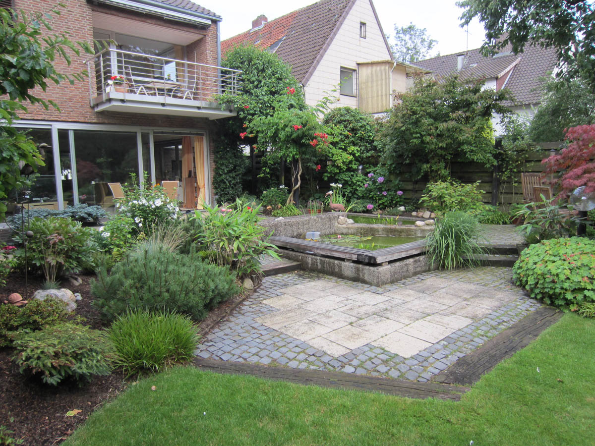 Die Modernisierung der bestehenden Gartenanlage sollte eine zusammenhängende Ebene schaffen, in die das bestehende Wasserbecken als Blickfang integriert wird.