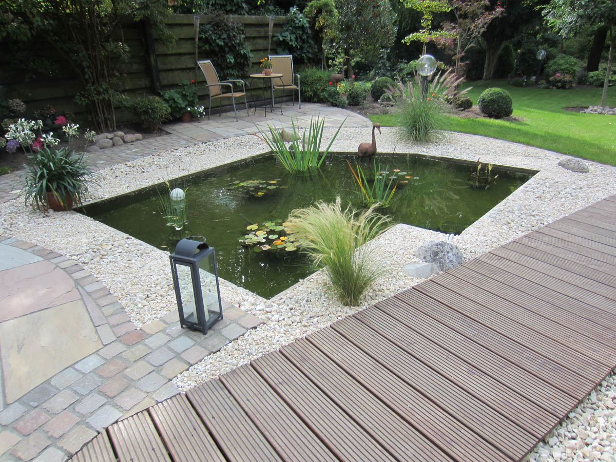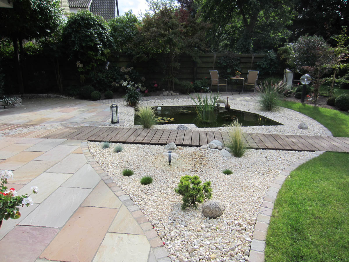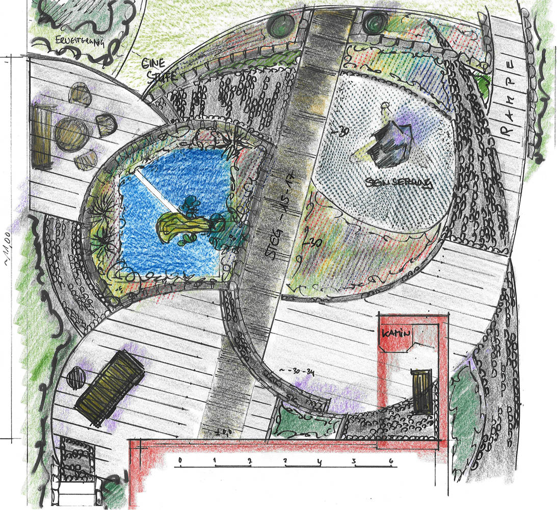 Die Modernisierung der bestehenden Gartenanlage sollte eine zusammenhängende Ebene schaffen, in die das bestehende Wasserbecken als Blickfang integriert wird.