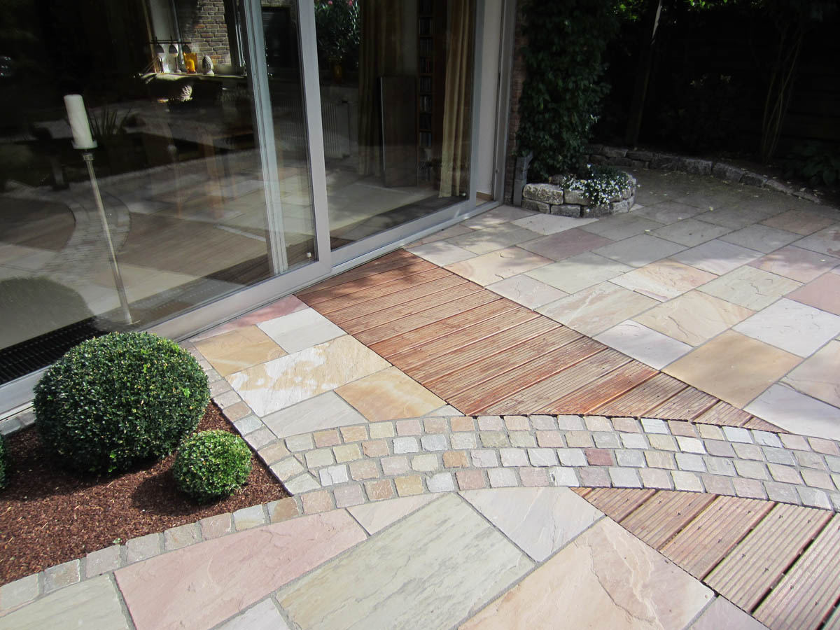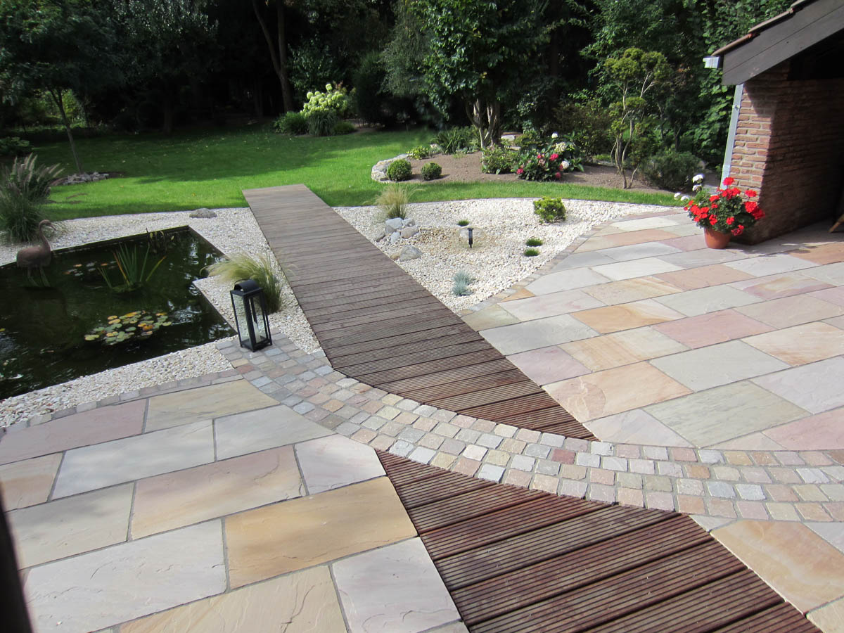 Für ein gleichmäßiges Niveau schütten wir die verschiedenen Terrassenebenen auf Höhe des Wohnzimmers auf. Vom Wohnzimmer aus führt ein Holzsteg durch die neu angelegte Ruhezone auf den Rasen. Um die Fläche interessant zu unterteilen, wurde mit Formen in der Pflasterung gespielt, wo geschwungene Elemente im Kontrast stehen zu der Geradlinigkeit des Steges. Dem Wohnhaus entsprechend verwenden wir Naturstein und Holz.