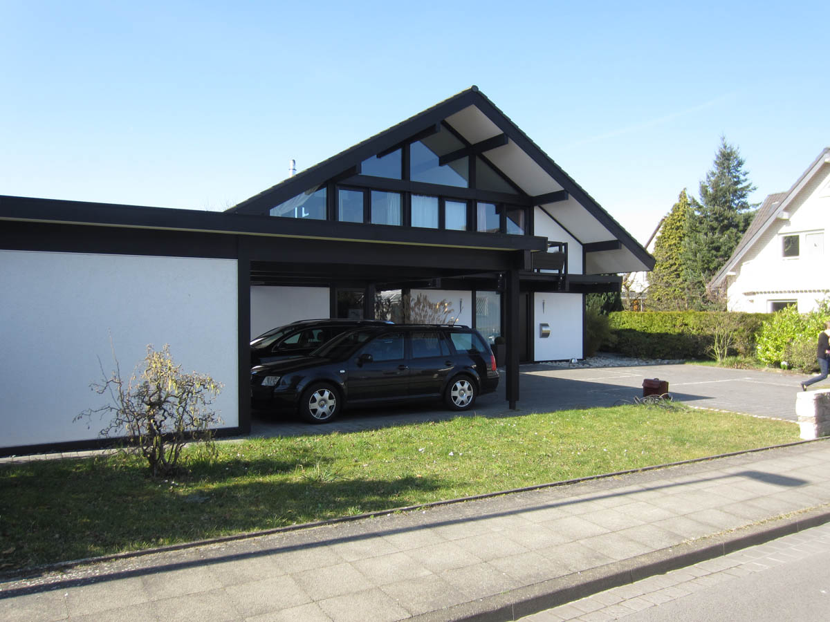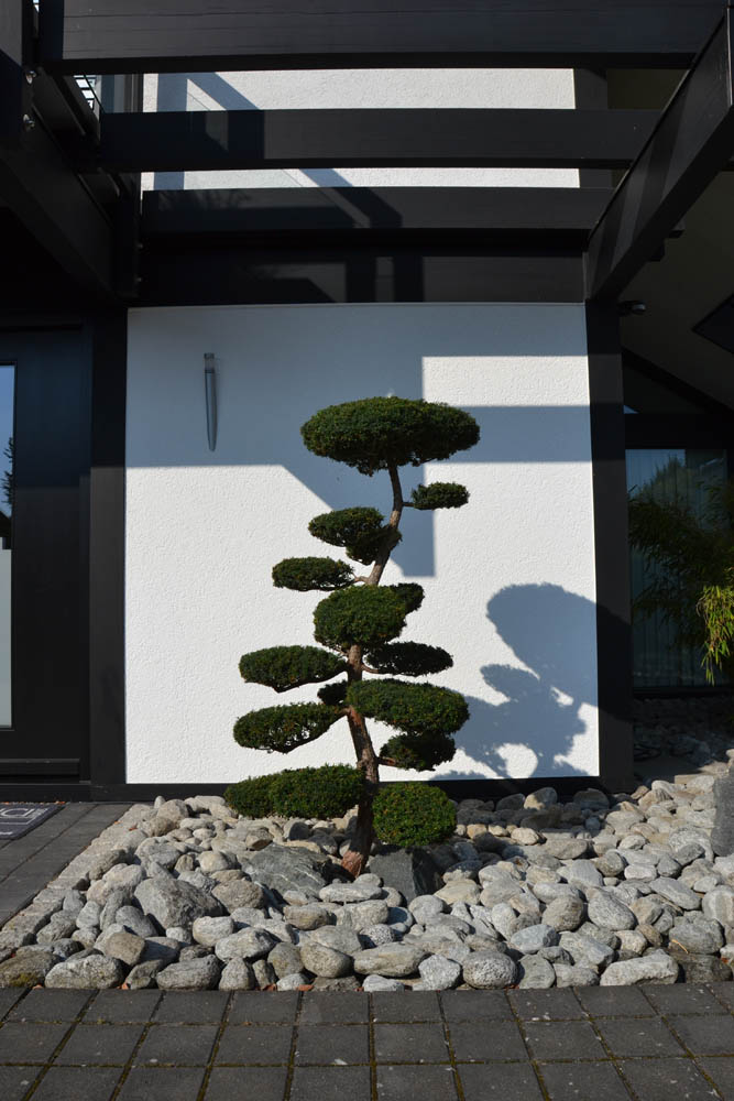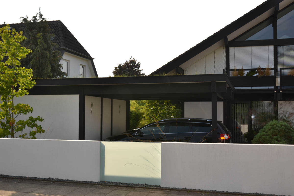 Passend zur besonderen Architektur des Hauses sollte die Einfriedung gestaltet werden. Ebenso der Architektur entsprechend wünschte man sich eine moderne und pflegeleichte Bepflanzung.