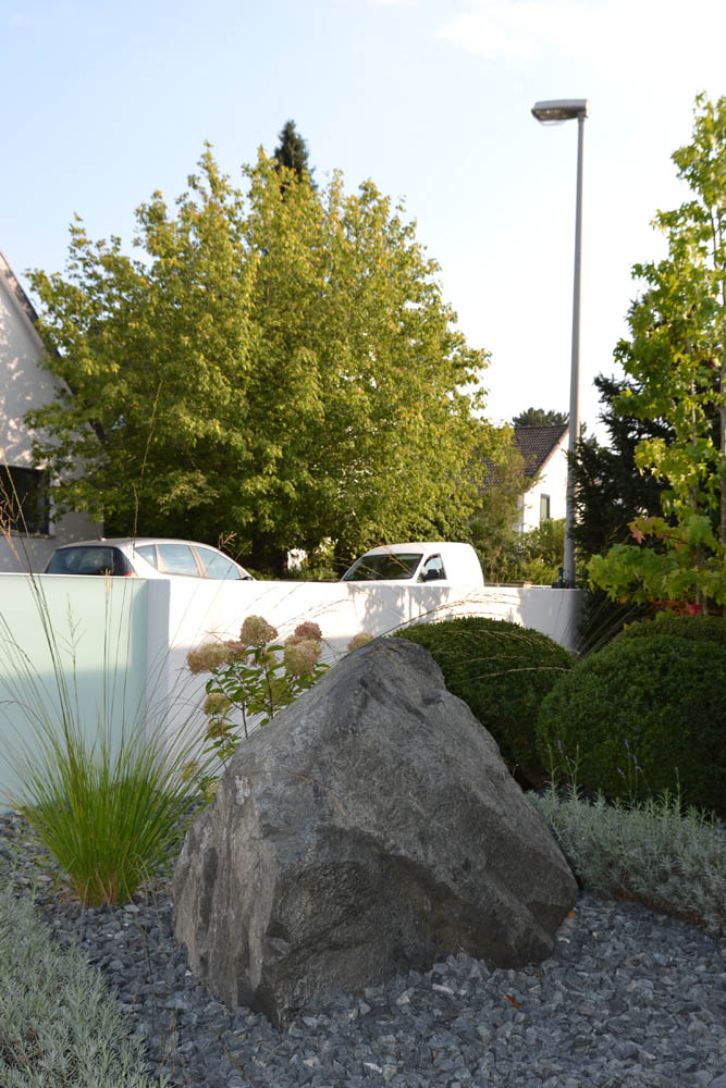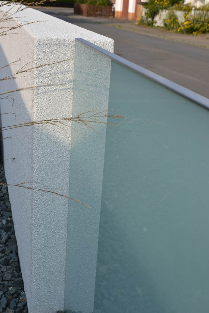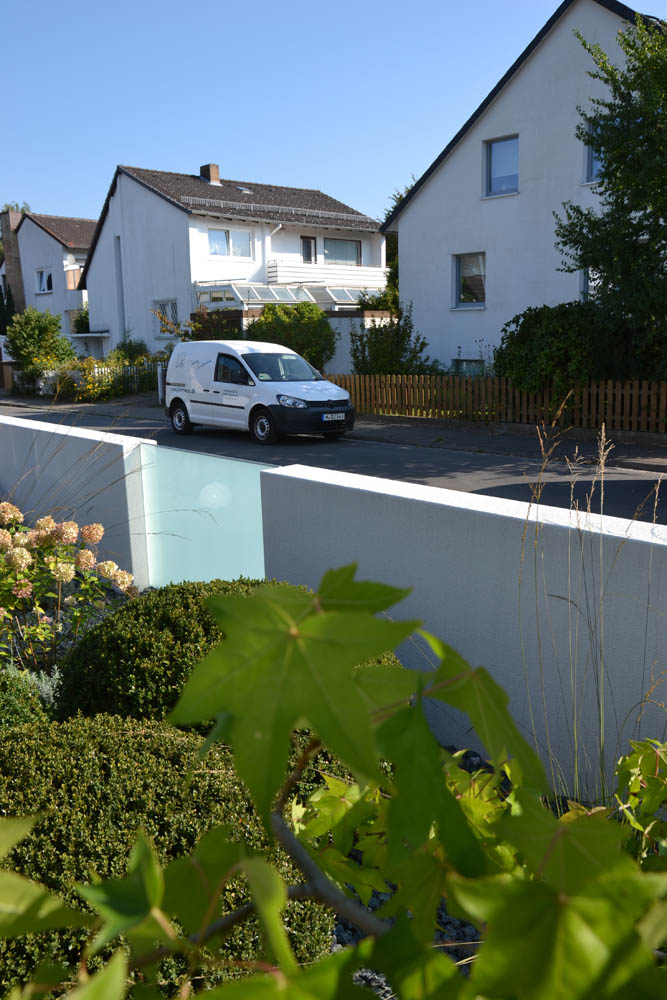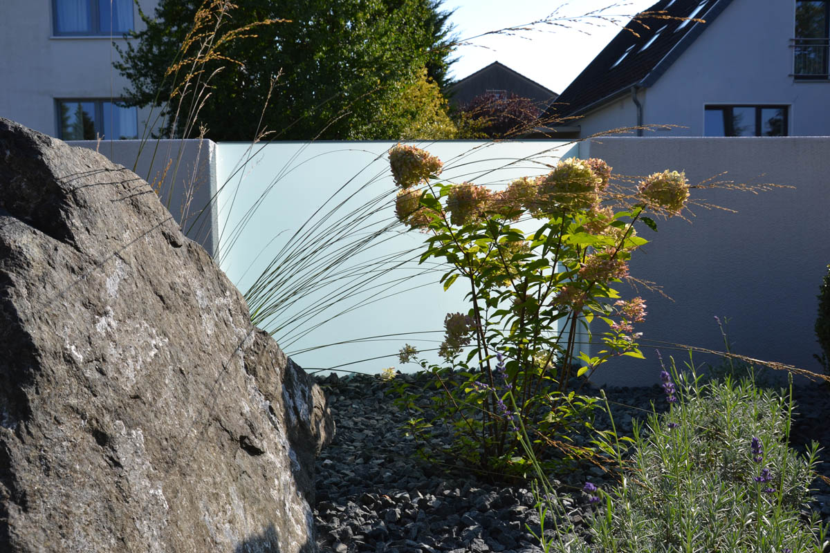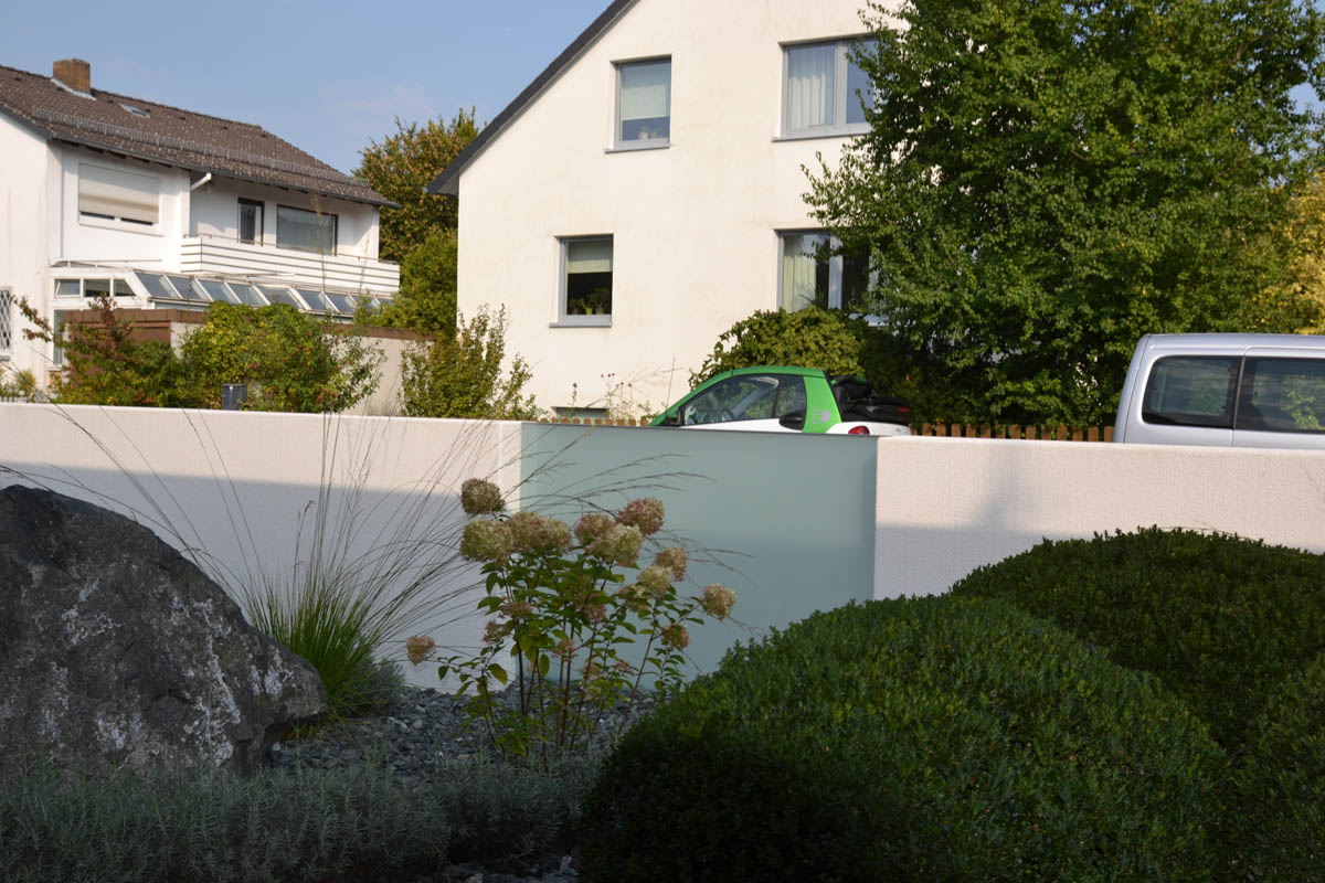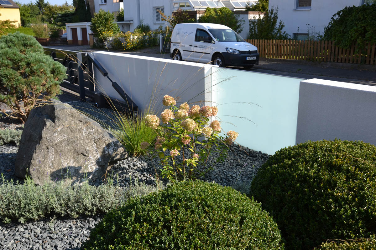 Der besondere Eindruck des Hauses wird durch eine modern gestaltete Einfriedung widergespiegelt. Wir verwenden dafür Glaselemente und Flexiwände, die halterlos verbaut werden, um die Leichtigkeit zu betonen. Damit die Klarheit der Linien nicht gestört wird, ist der Briefkasten in die Wand integriert. Die Bepflanzung spielt mit Kontrasten von streng geschnittenen Formen zu Gräsern und gebrochenem Felsen.
