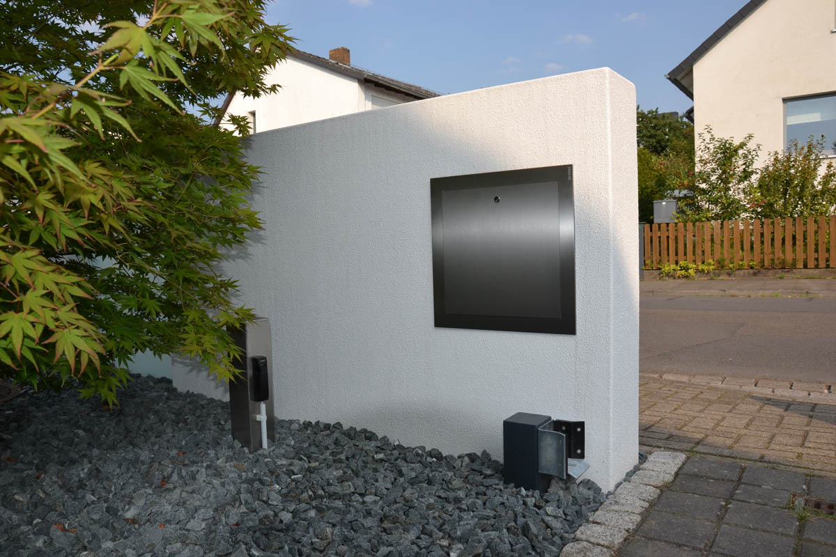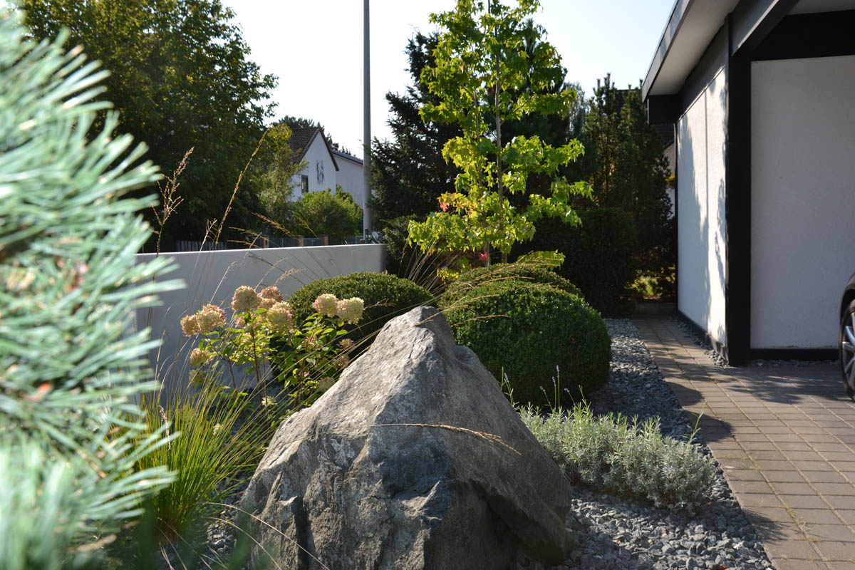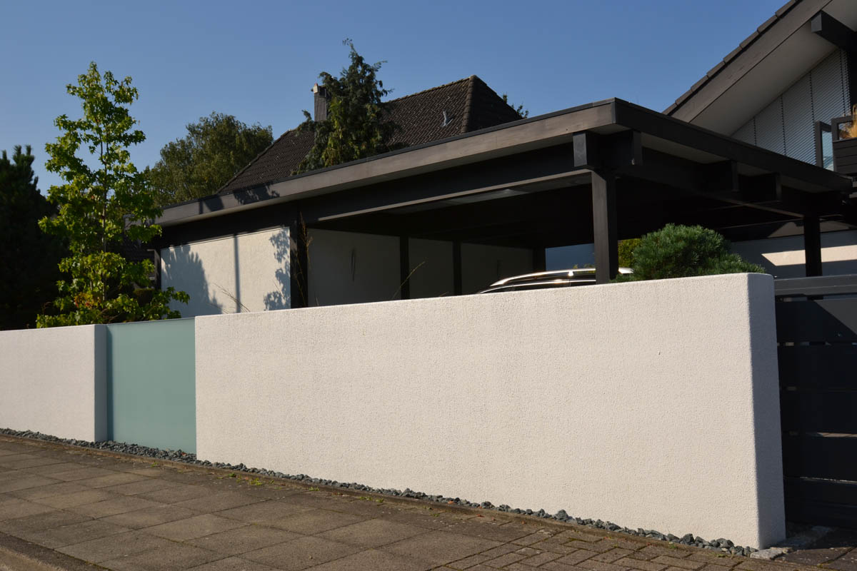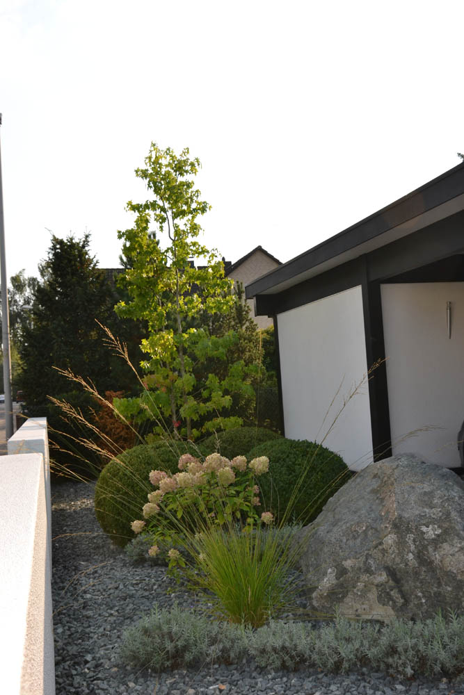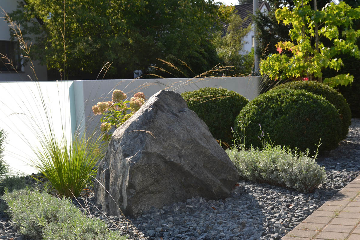 Der besondere Eindruck des Hauses wird durch eine modern gestaltete Einfriedung widergespiegelt. Wir verwenden dafür Glaselemente und Flexiwände, die halterlos verbaut werden, um die Leichtigkeit zu betonen. Damit die Klarheit der Linien nicht gestört wird, ist der Briefkasten in die Wand integriert. Die Bepflanzung spielt mit Kontrasten von streng geschnittenen Formen zu Gräsern und gebrochenem Felsen.