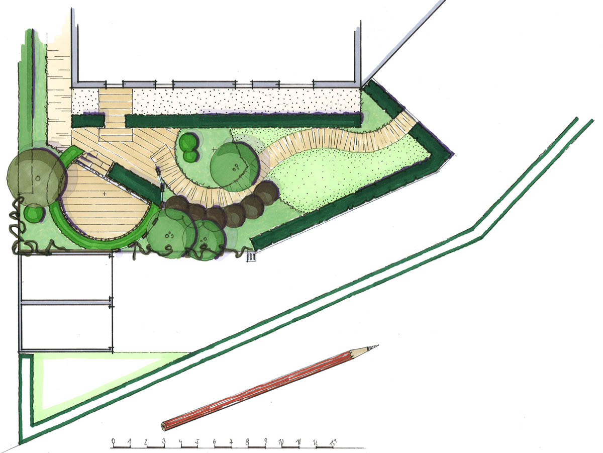 Ein ehemaliges Tankstellengelände direkt an der Straße gelegen ohne jeglichen Bewuchs sollte zu einem abgeschirmten Traumgarten für entspannte Stunden werden.