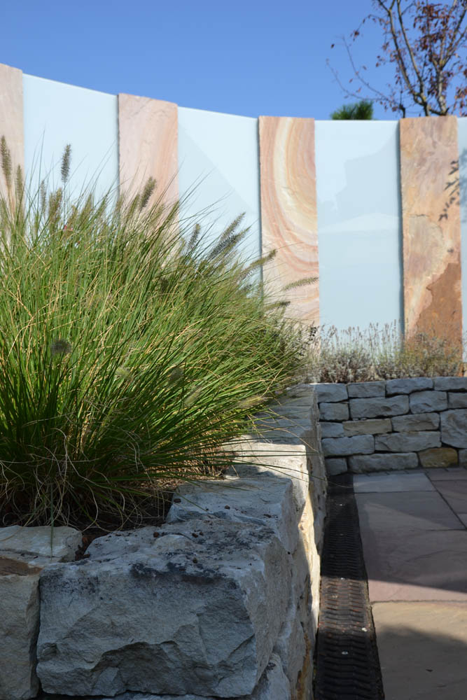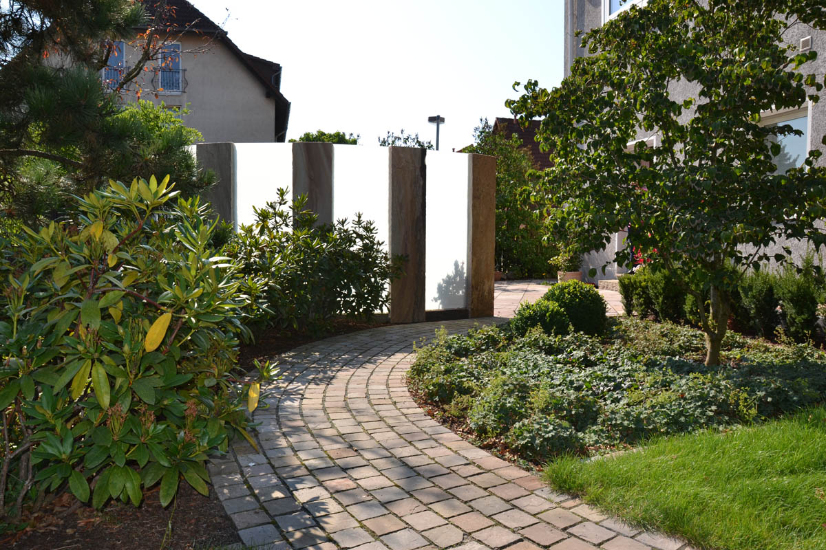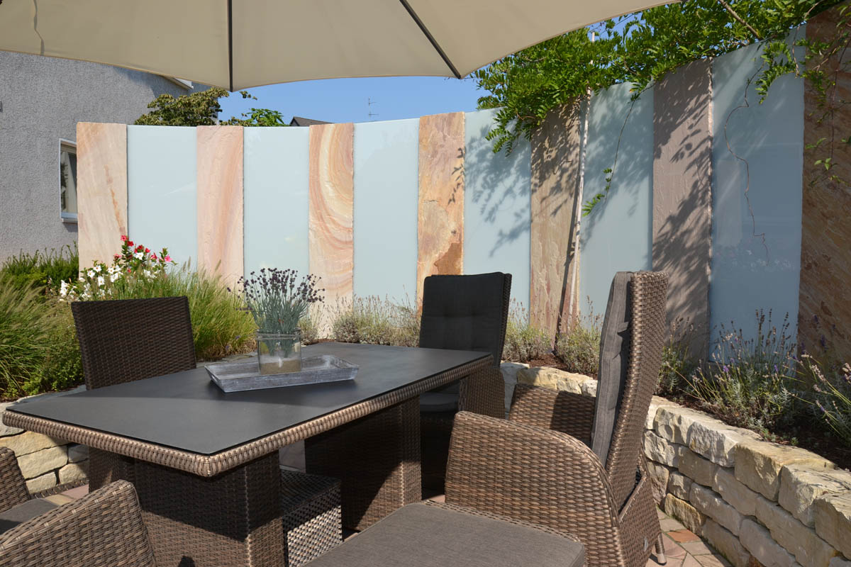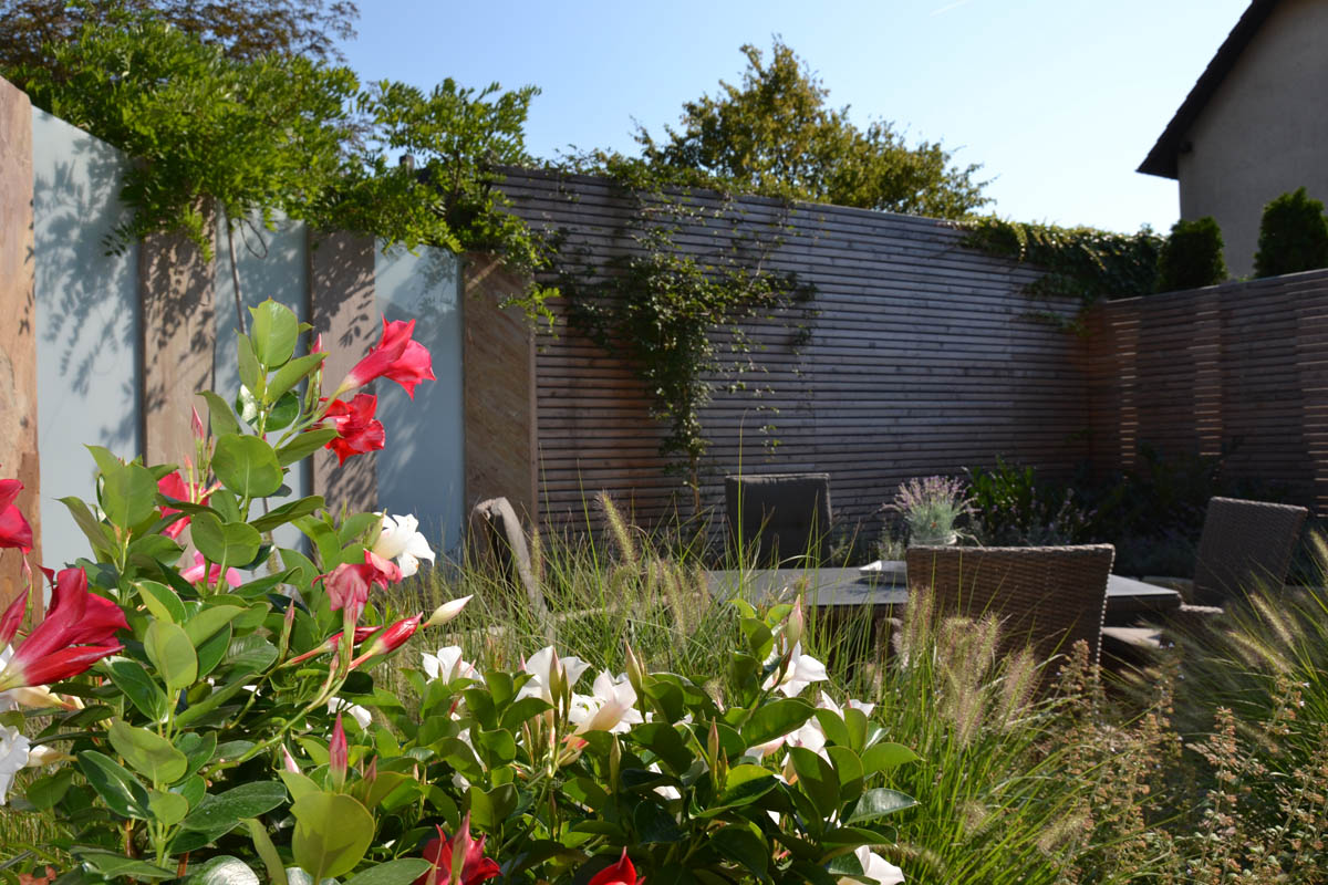 Die Herausforderung ist die exponierte Lage, die eine Tankstelle mit sich bringt: direkt an der Straße. Also muss der Garten von der Straße abgeschirmt werden, ohne dass dieser eng und eingemauert wirkt. Dies erreichen wir über eine halbrunde Einfassung mit Palisaden und Glas: So entsteht ein sicht- und windgeschützter Sitzplatz, der durch warme Erdtöne ein mediterranes Flair bietet. Die direkt angrenzende Garage wird mit Rhombusholz verkleidet und so in die naturnahe Gestaltung warmer Töne eingebunden. Eine abwechslungsreiche Bepflanzung macht das Refugium für gemütlichen Stunden perfekt.